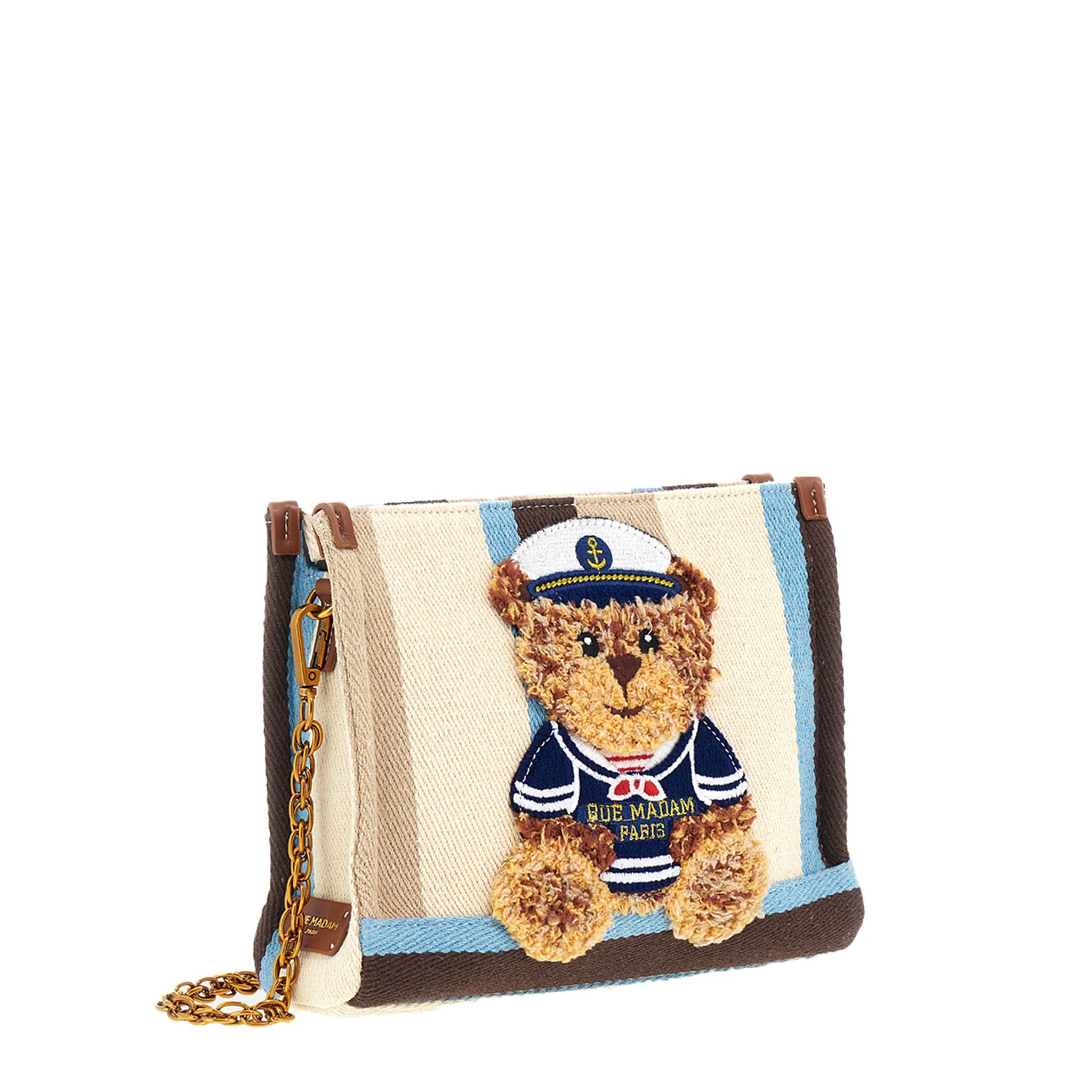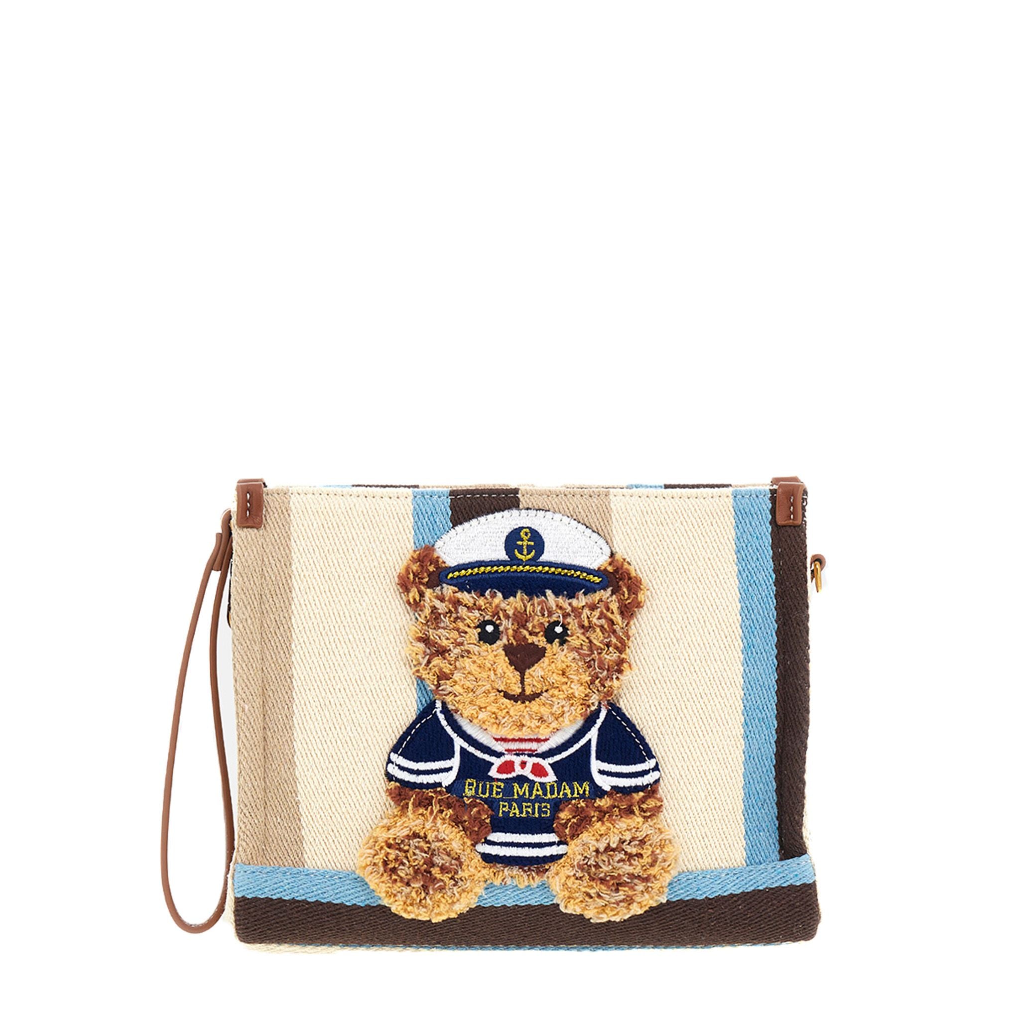 Clutch in canvas dal design compatto e contemporaneo, valorizzata dal fondo a contrasto e dal nuovo ricamo effetto peluche dell’orsetto Sailor Marvin, che aggiunge un tocco affettuoso e distintivo. Dotata di laccio da polso, dettagli in ecopelle e catenella removibile per un look versatile ed elegante. Interno con fodera in cotone e tasca, ideale per organizzare con stile gli oggetti essenziali. Dimensioni L 25.5 x H 20 x P 8 cm
