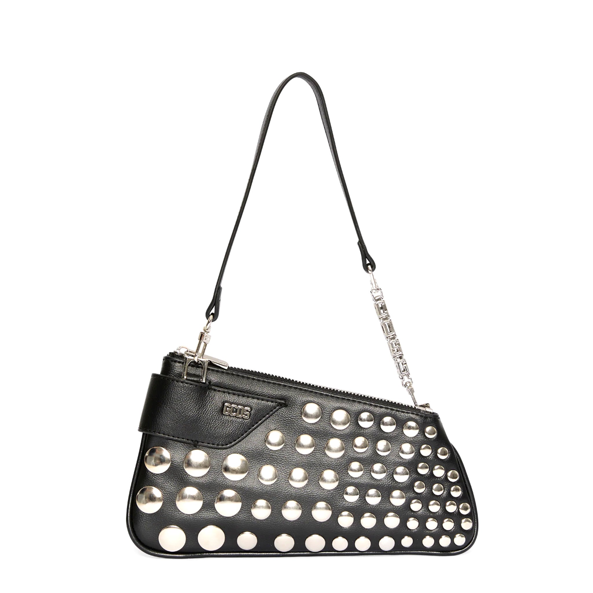 Borsa a spalla realizzata con costruzione rigida e superficie ricoperta con borchie circolari metalliche. Chiusura con zip.