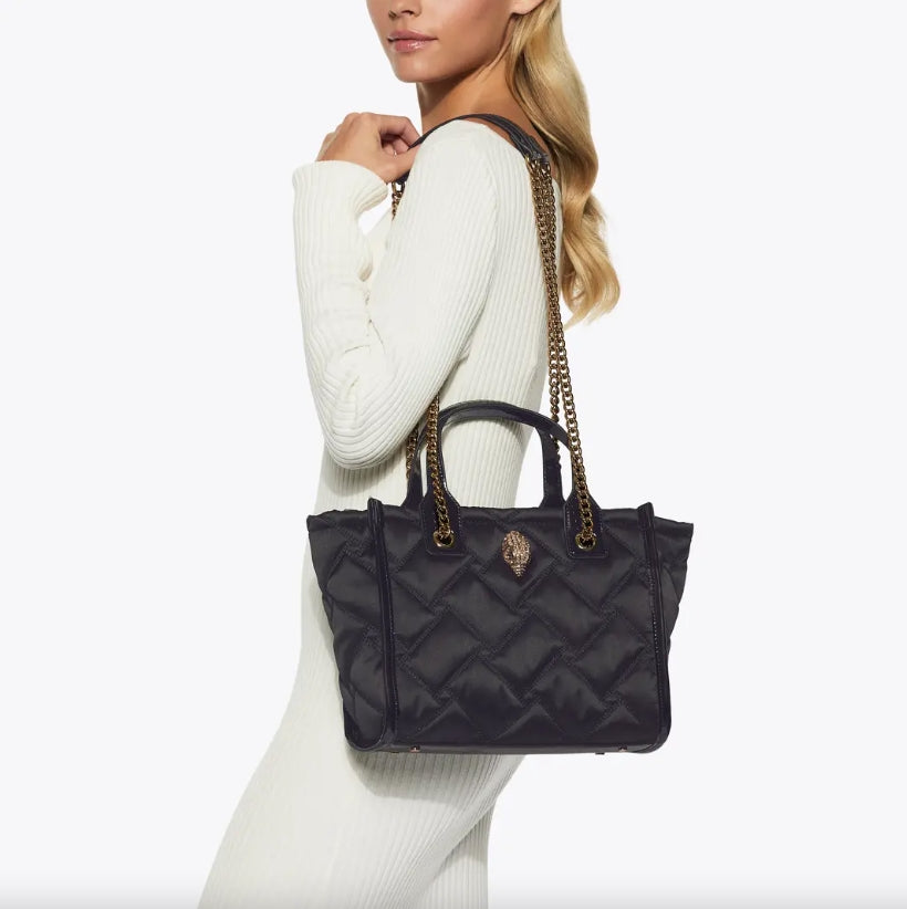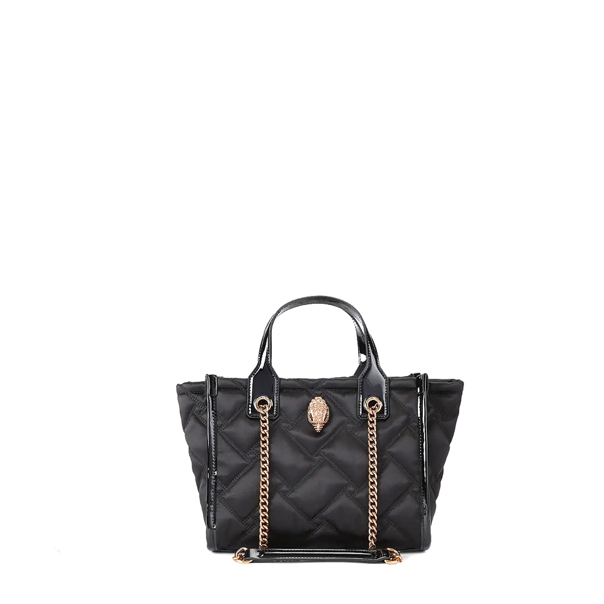 Questa piccola borsa Hoxton Shopper è realizzata in nylon nero con dettagli trapuntati. Le finiture sono in vernice nera e sulla parte anteriore della borsa è presente una testa d'aquila dorata con cristalli.