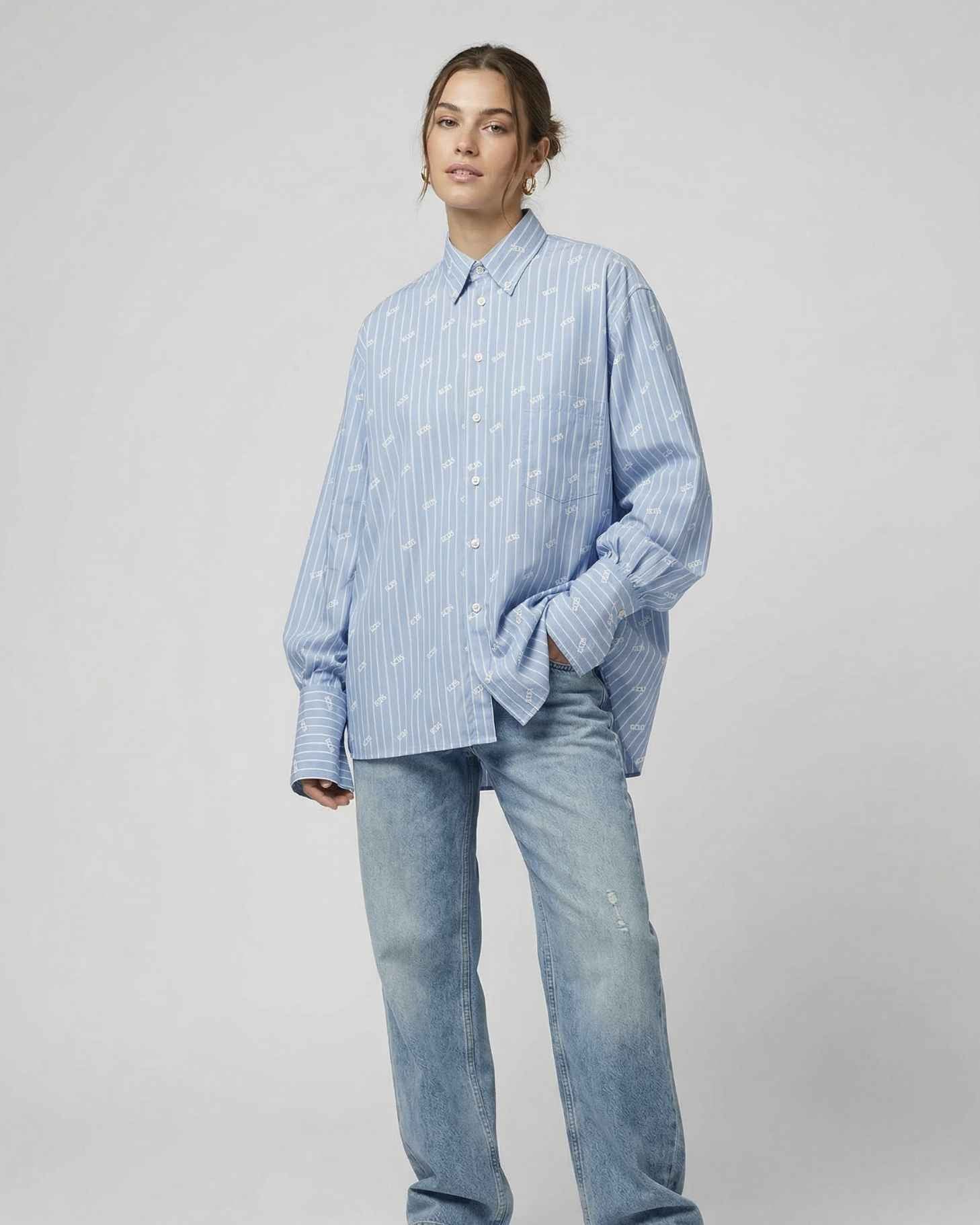 Camicia a maniche lunghe in popeline di cotone con motivo gessato e logo GCDS all-over. Il modello presenta colletto classico, chiusura frontale con bottoni e polsini con abbottonatura singola. Vestibilità ampia con spalle scese e silhouette morbida.
