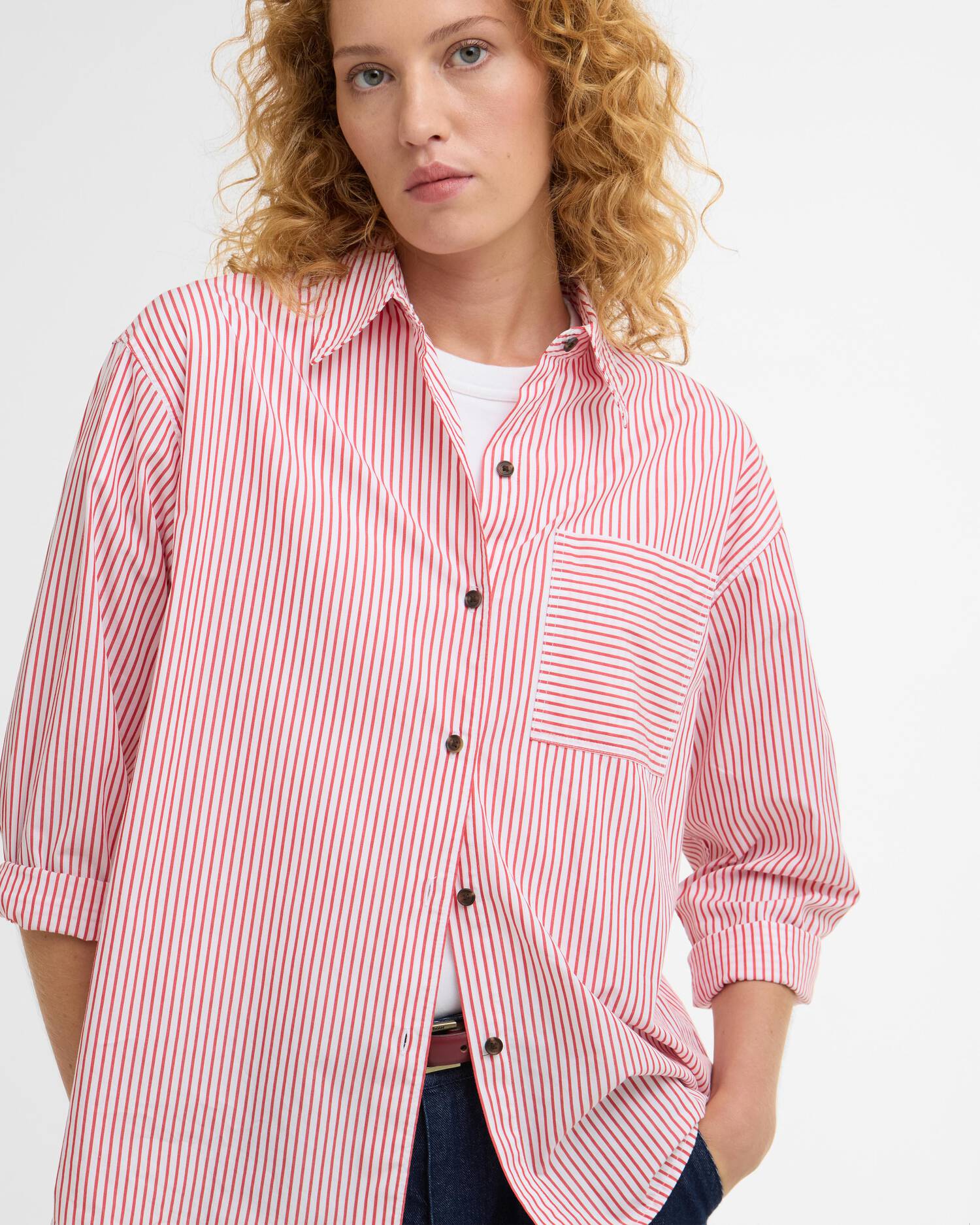 La camicia Polly con motivo a righe di Barbour infonde un tocco di stile disinvolto in una silhouette classica. Realizzato in morbido cotone e impreziosito da un motivo a righe senza tempo, presenta un colletto a punta, spalle scivolate e bottoni in finto corno con logo, dettagli che strizzano l’occhio all’heritage del brand. Questo capo elegante, perfetto per un look da tutti i giorni, è rifinito da una tasca sul petto e una sottile barretta identificativa sul retro del collo.