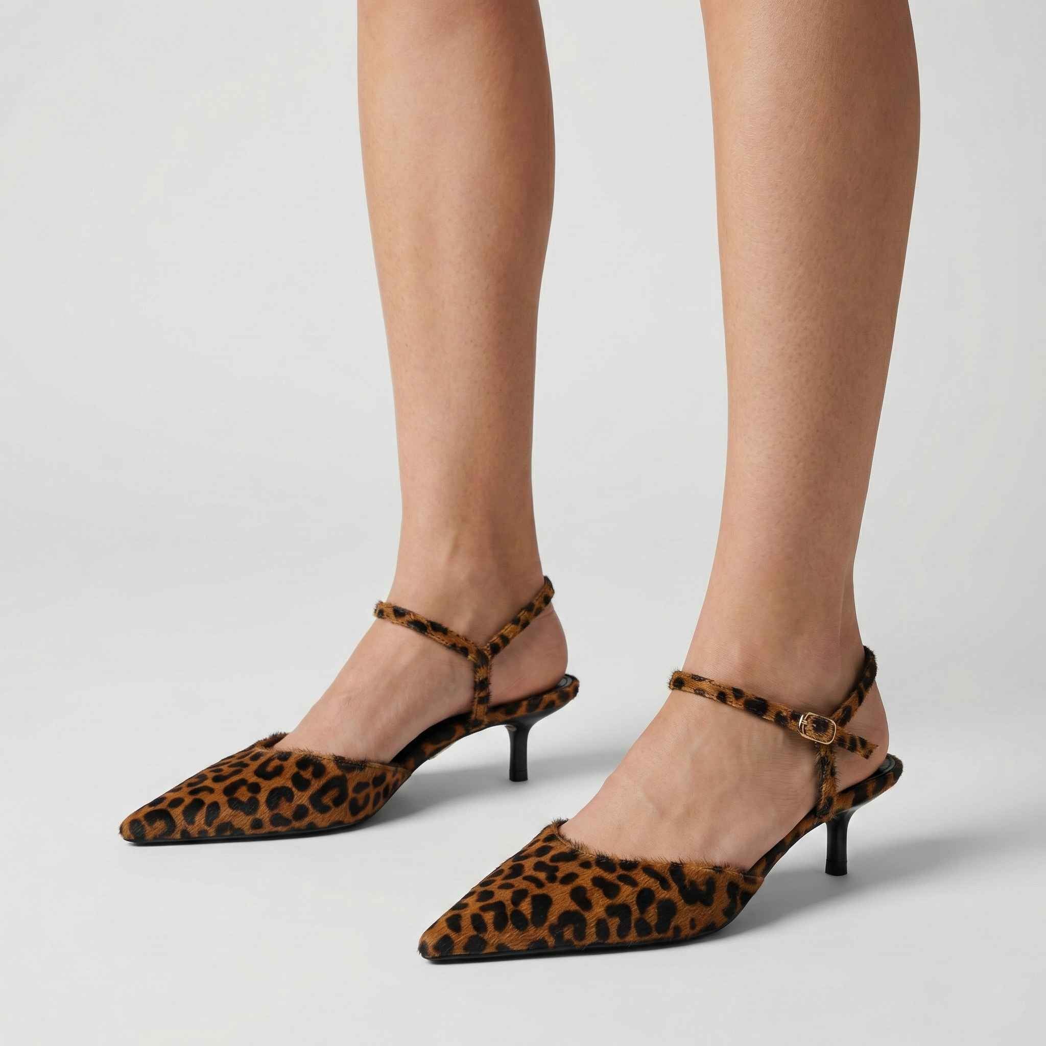 Aggiungi una nota di animalier chic al tuo look con questa décolleté con tacco basso, pensata per le donne che vogliono distinguersi con eleganza.