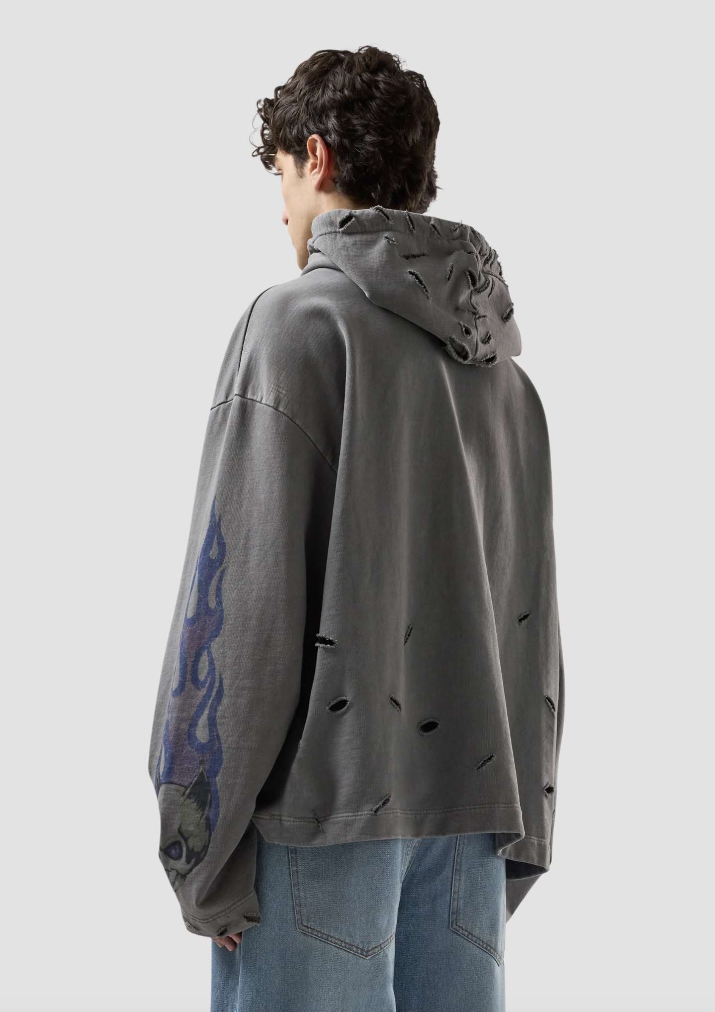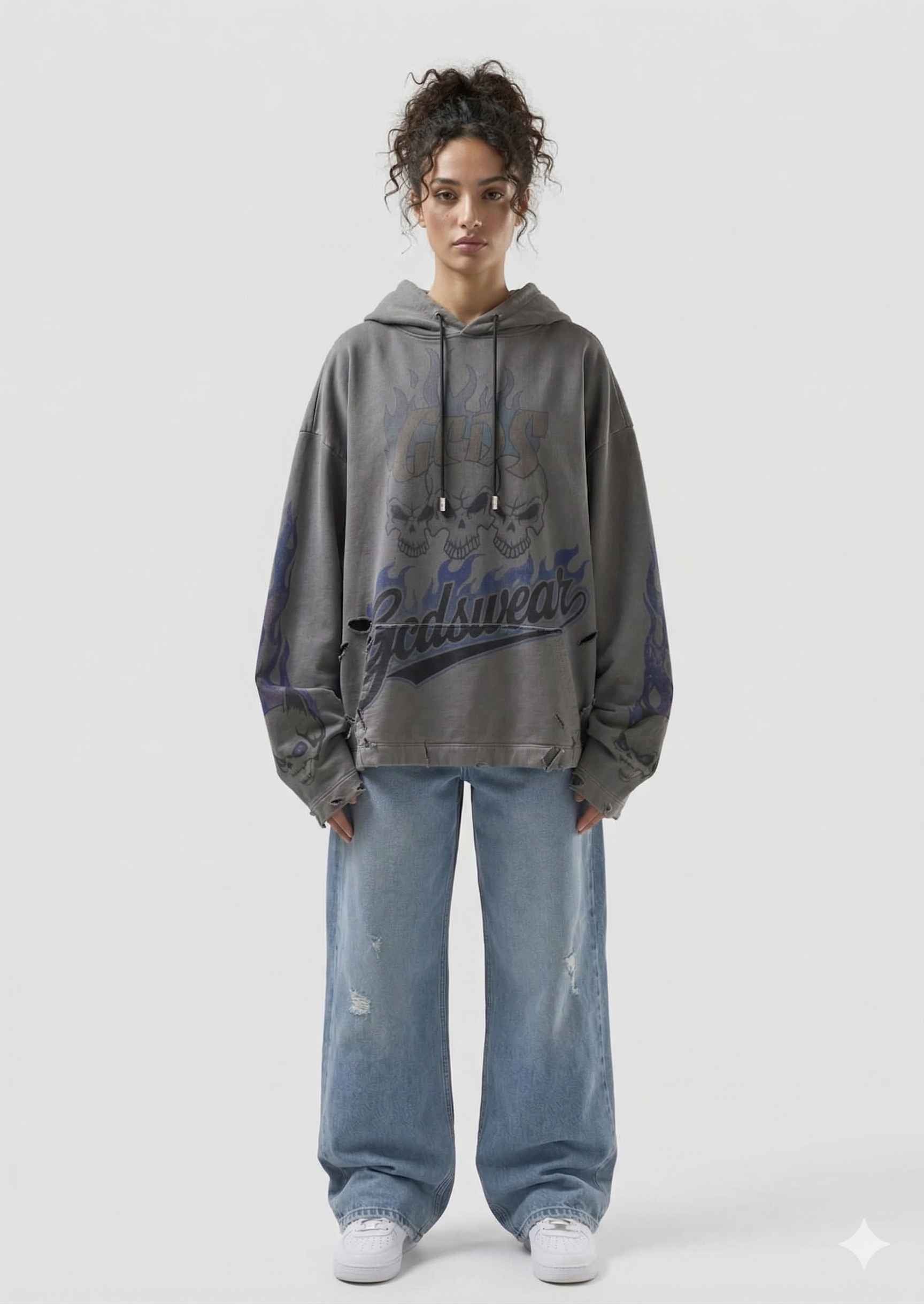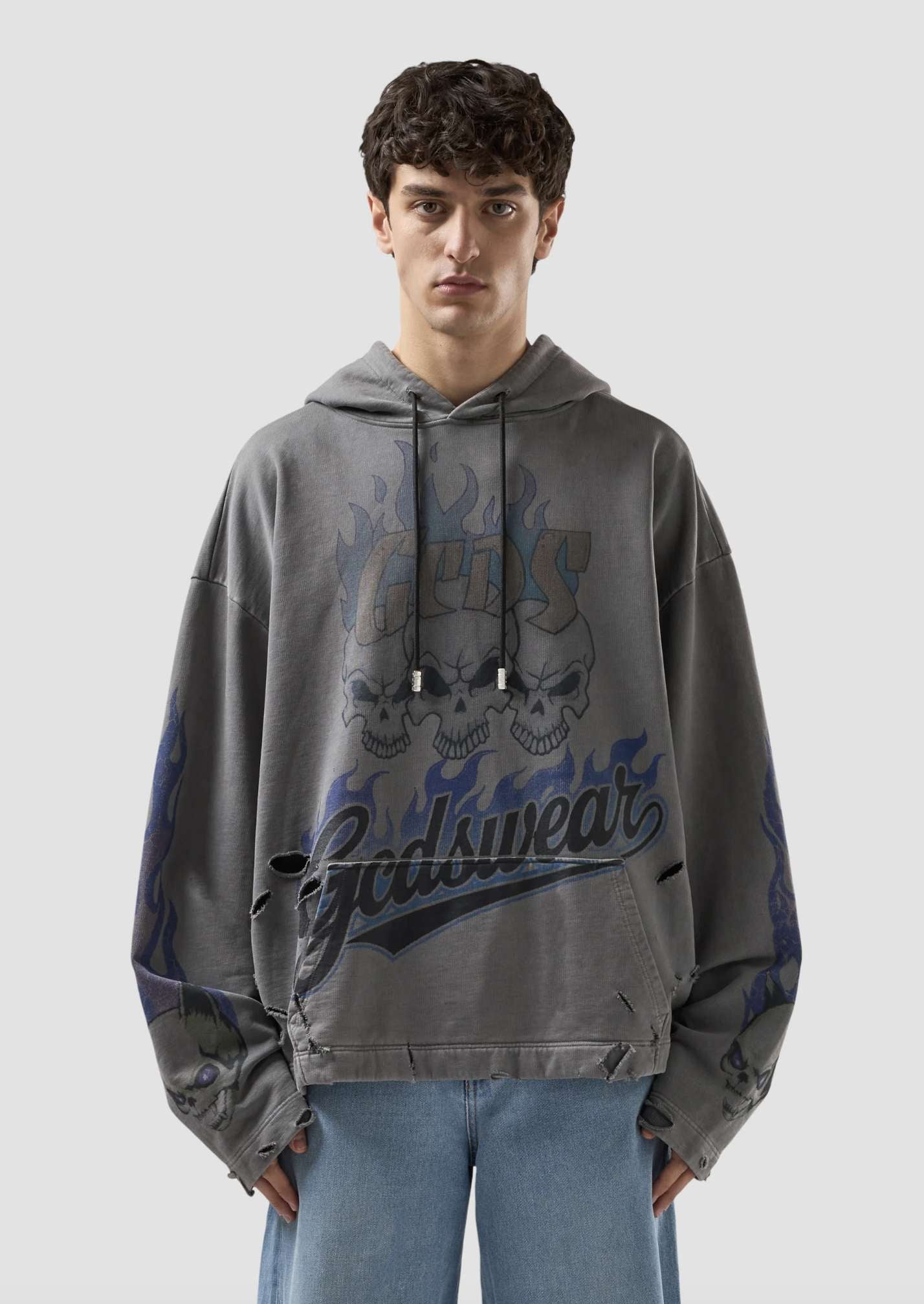 Felpa in cotone con cappuccio e stampa "Riders" effetto used. Il design presenta grafiche di teschi e fiamme sulle maniche e sulla parte frontale, con logo GCDSWEAR integrato nella composizione. Il modello è completato da coulisse regolabile, tasca a marsupio e finiture a costine su polsini e fondo. Vestibilità oversize.