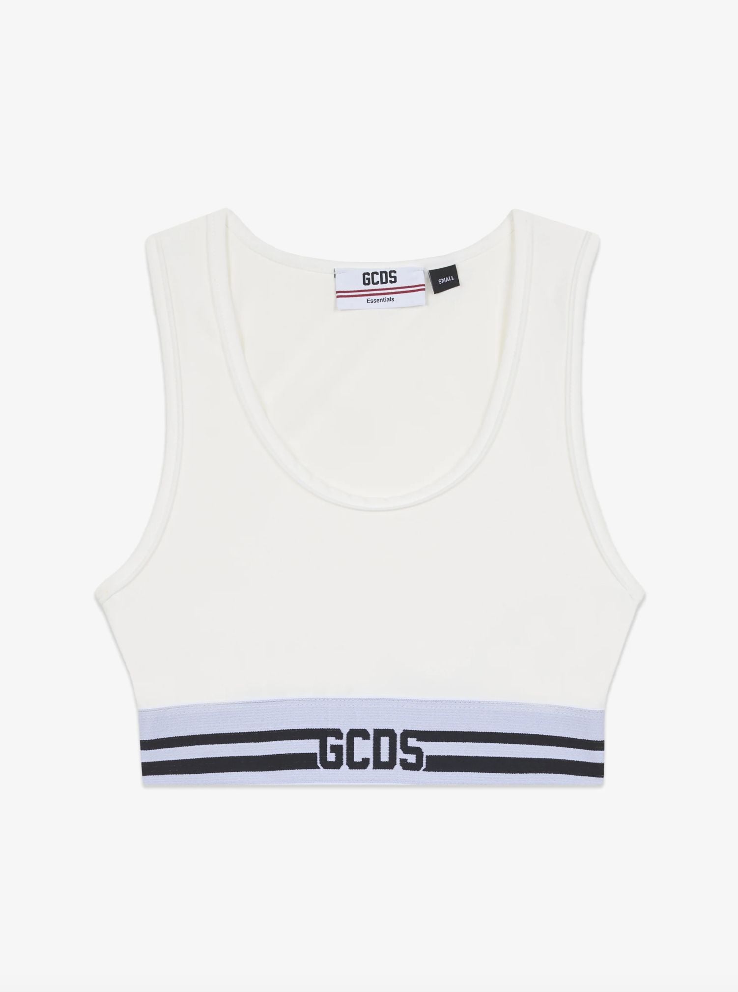 Top mini elasticizzato, scollo arrotondato e fascia elastica con righe e logo GCDS a contrasto.