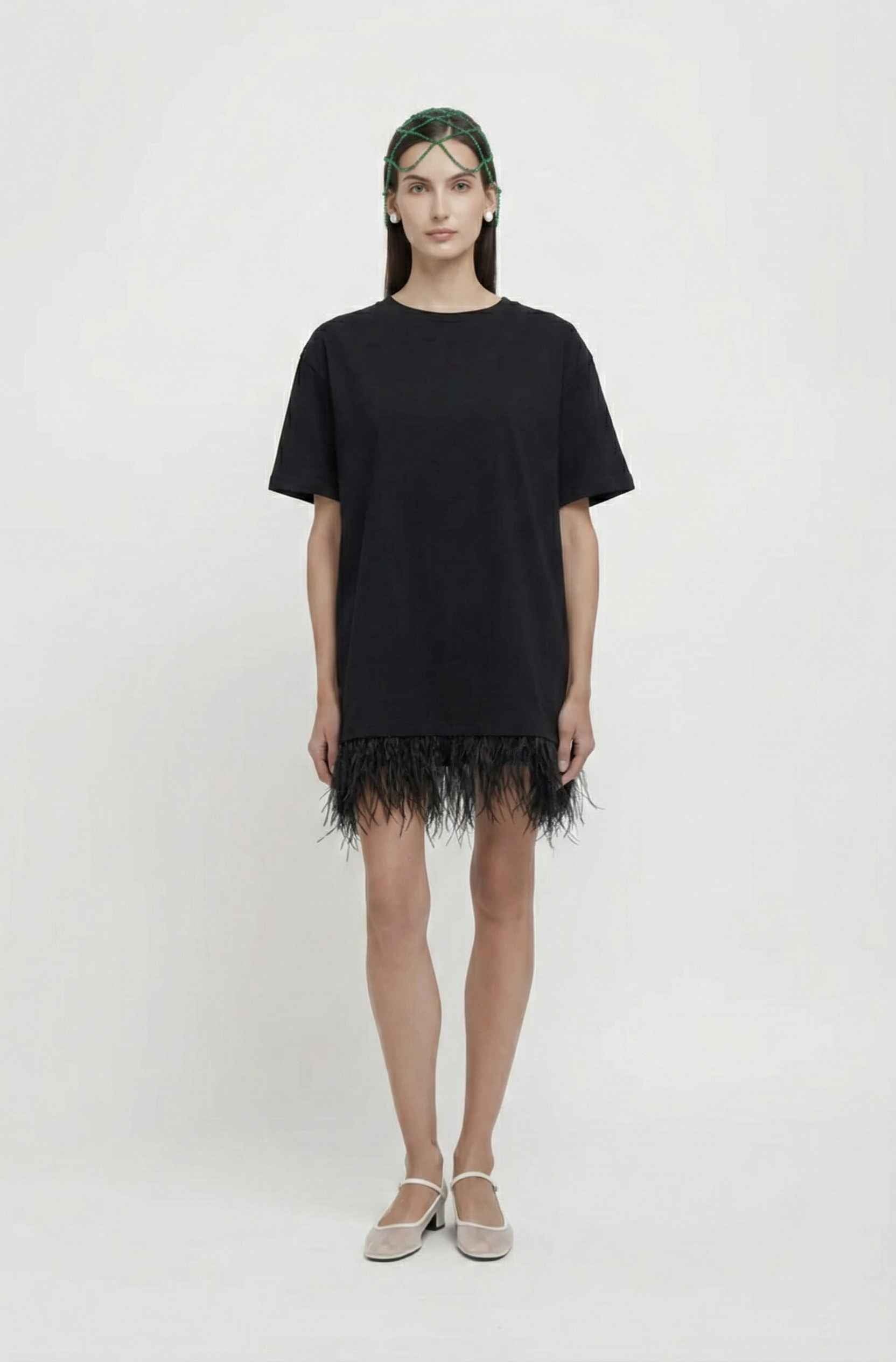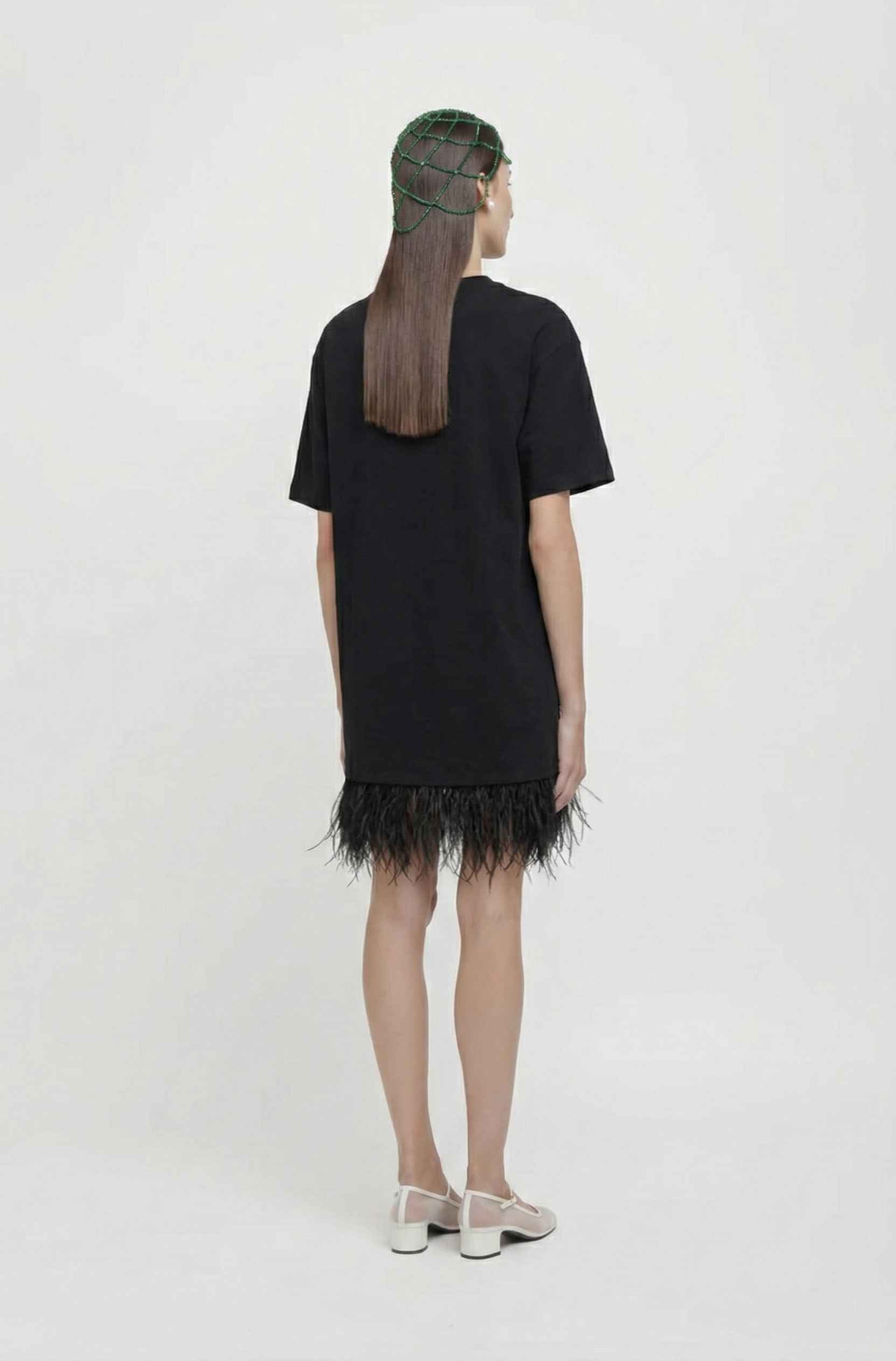 Mini abito a t-shirt in jersey elasticizzato con dettaglio piume sul fondo. La modella è alta 1.74m e veste una taglia M 100% CO
