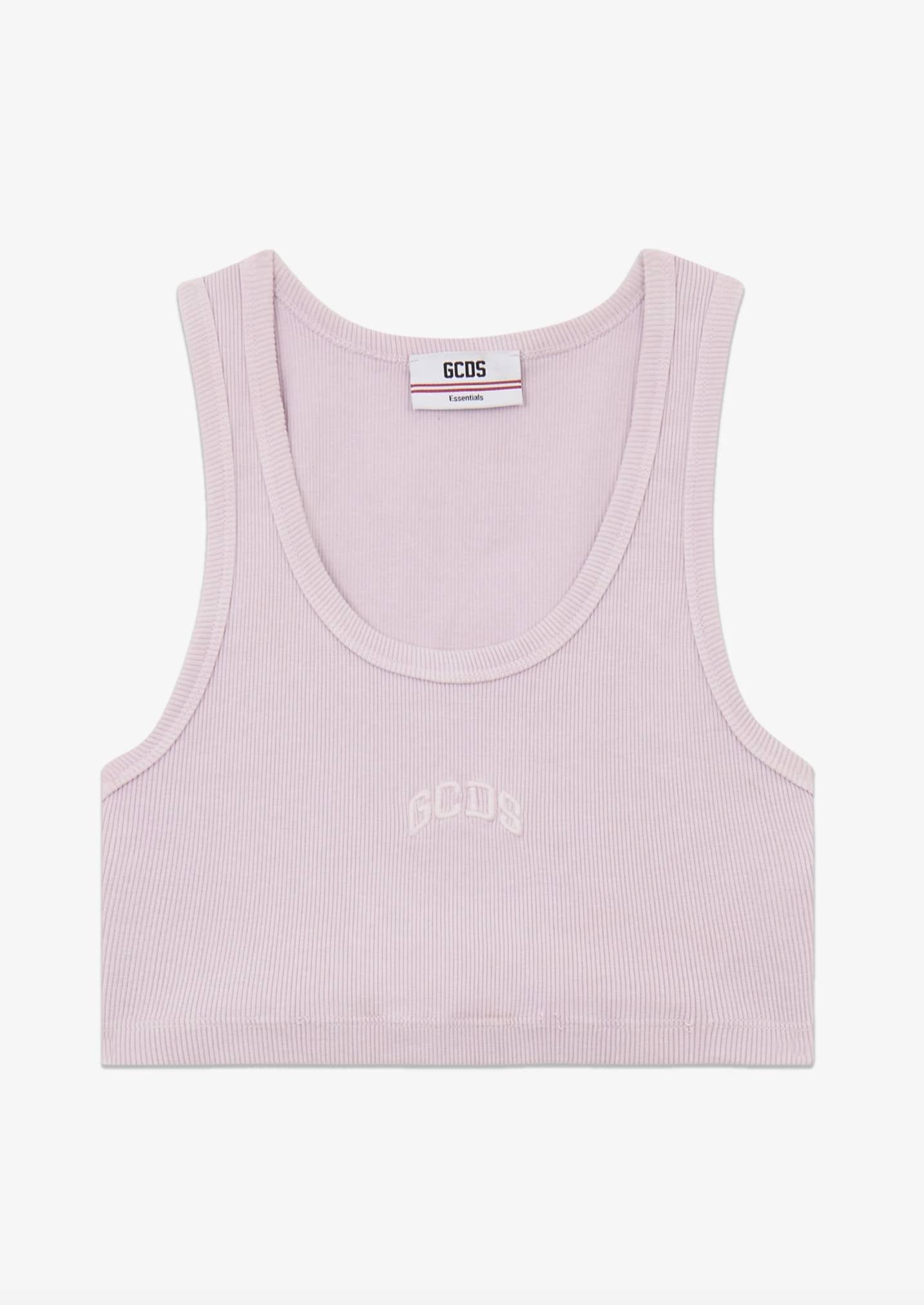 Mini top crop in misto cotone elasticizzato a costine. Il modello presenta maniche a giro, scollo ampio e micro logo GCDS ricamato sul petto tono su tono. Vestibilità aderente.