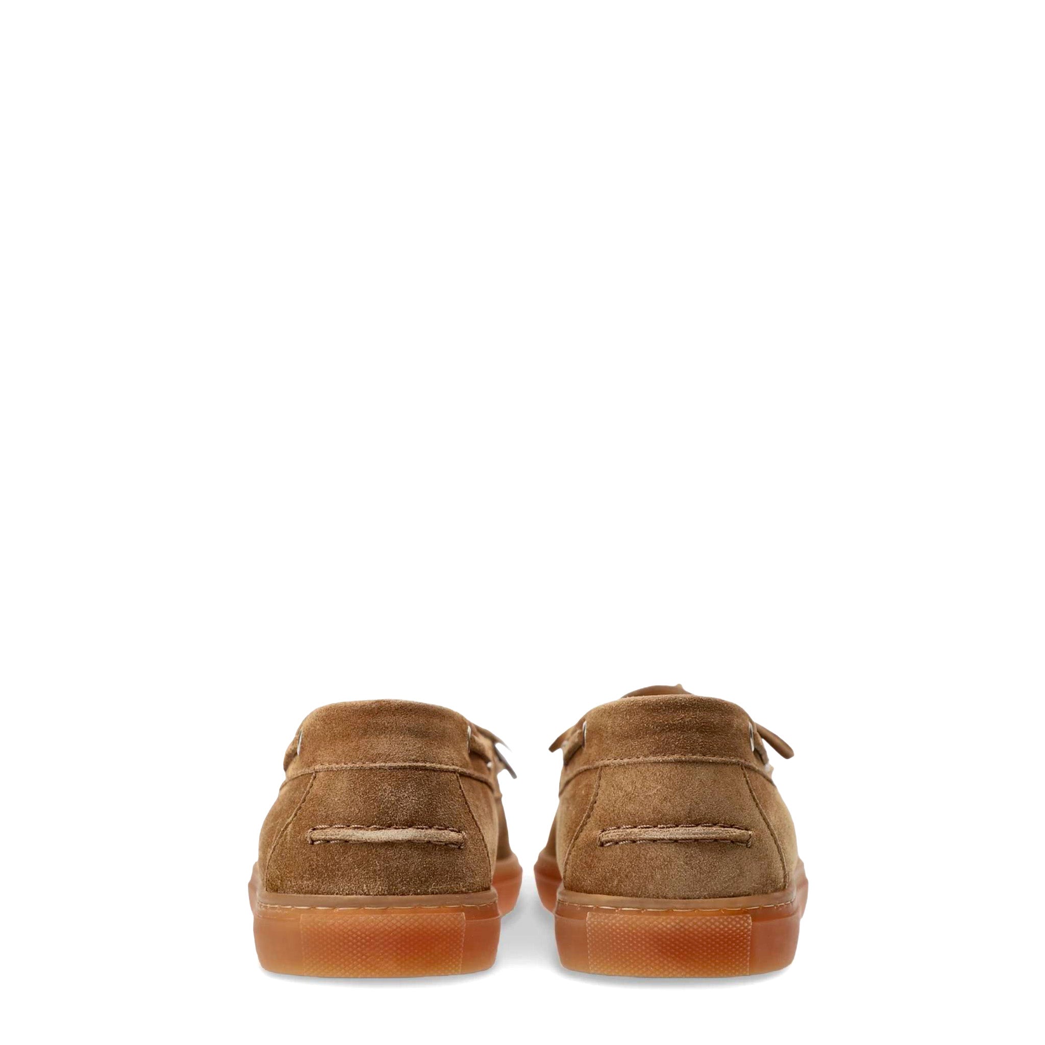 Mocassini da barca in morbida pelle scamosciata. Silhouette rilassata. Elementi minimalisti con dettagli ricamati. Cuciture in rilievo sulla punta. Logo sulla linguetta e sulla soletta. Modello slip-on. Allacciatura decorativa. Dettagli in metallo. Punta tonda. Suola piatta e testurizzata. Mocassini eleganti per un look estivo rilassato.