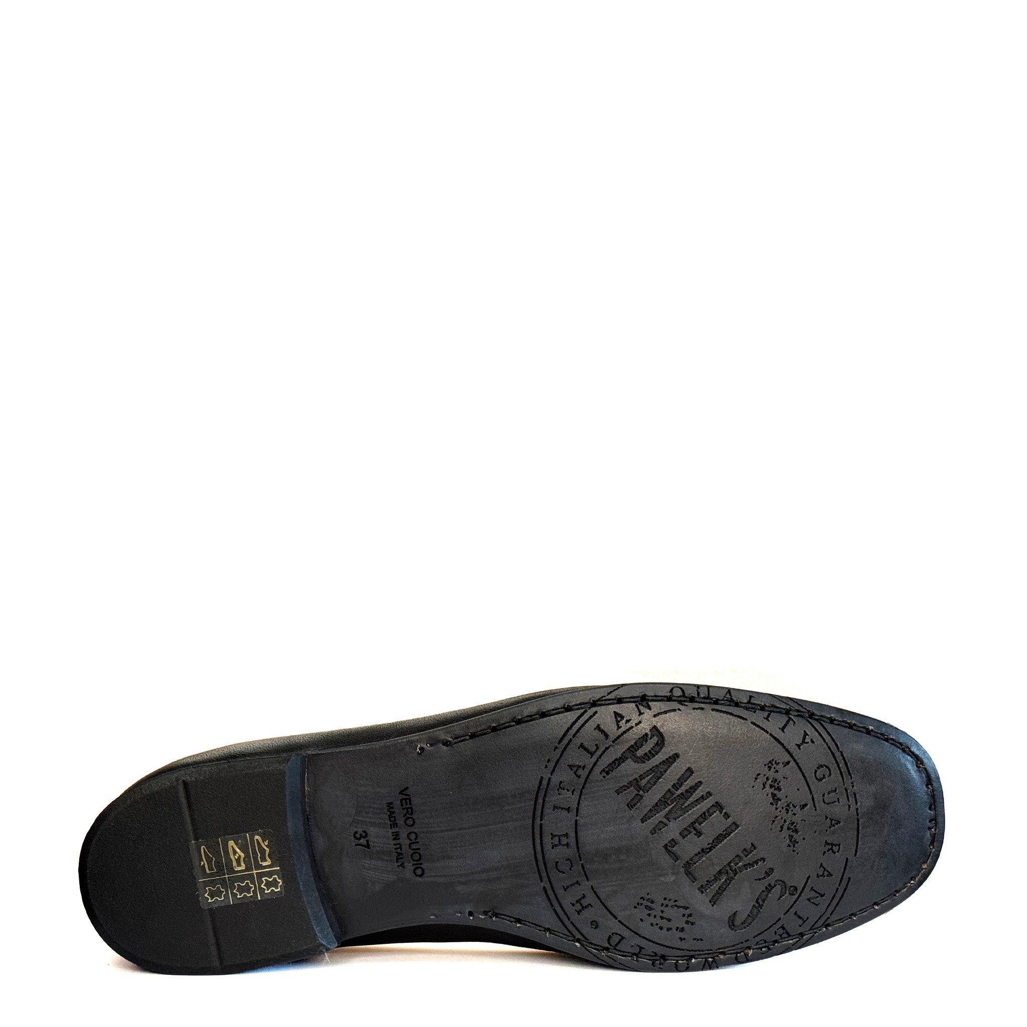 Mocassino in vera pelle nera con dettaglio nappina rossa Fondo in vero cuoio Made in Italy
