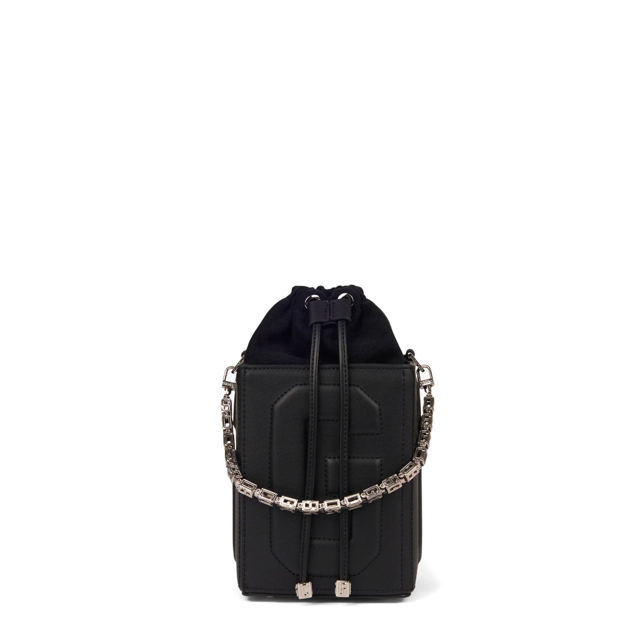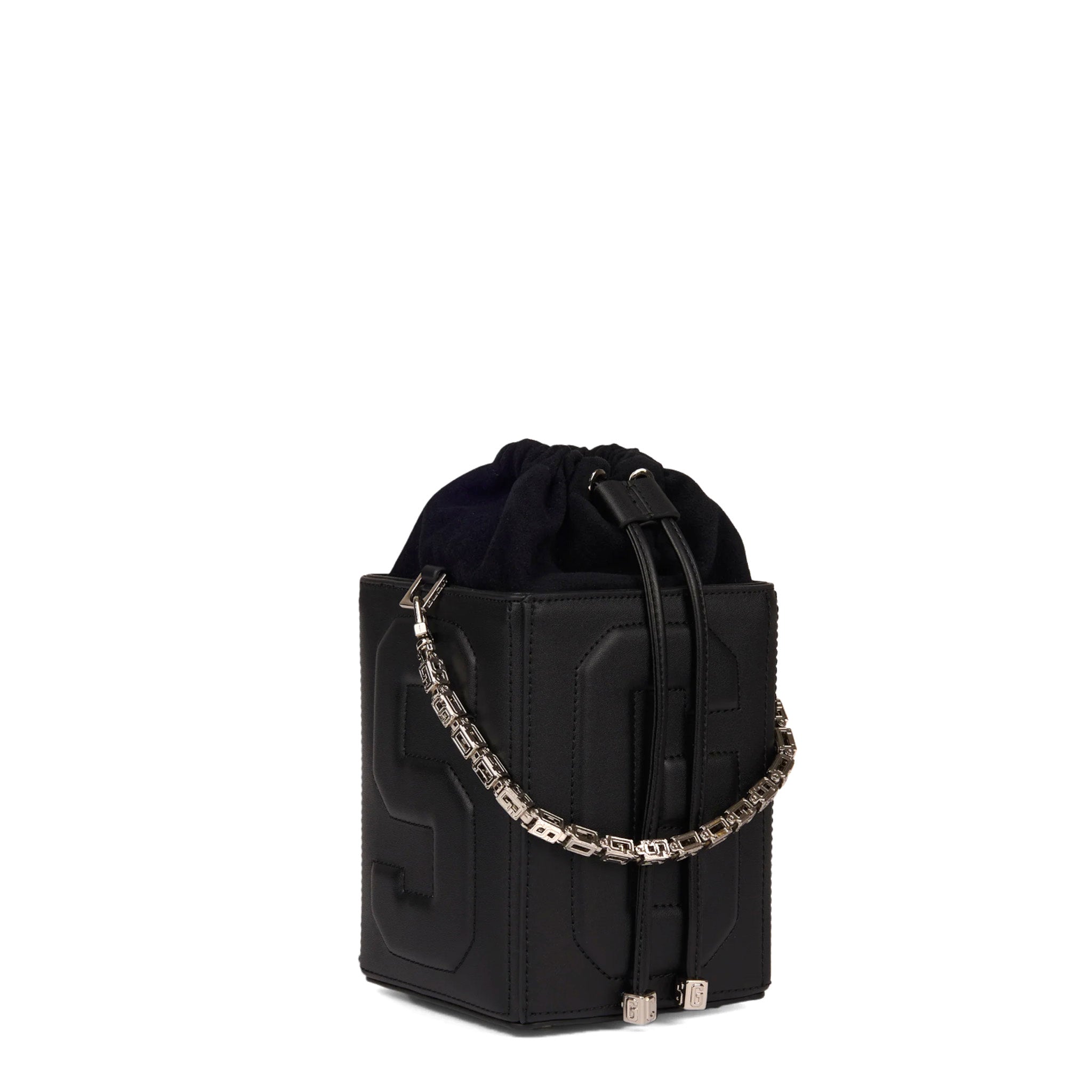 Borsa a secchiello dalla struttura rigida a forma di dado, realizzata in PU effetto pelle. Presenta pannelli geometrici con logo GCDS in rilievo 3D su tutti i lati. L’interno è dotato di sacca in tessuto con chiusura a coulisse. Tracolla removibile in catena intrecciata con PU coordinato e manico superiore abbinato.