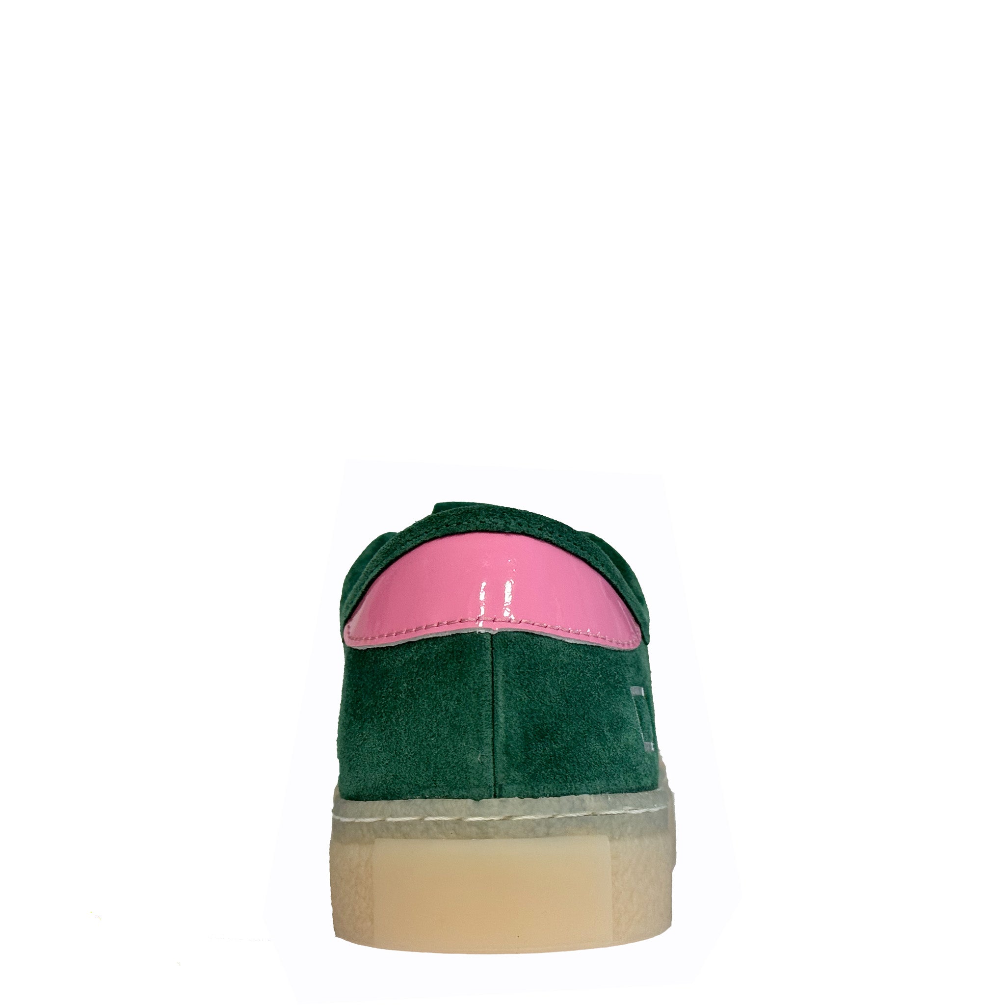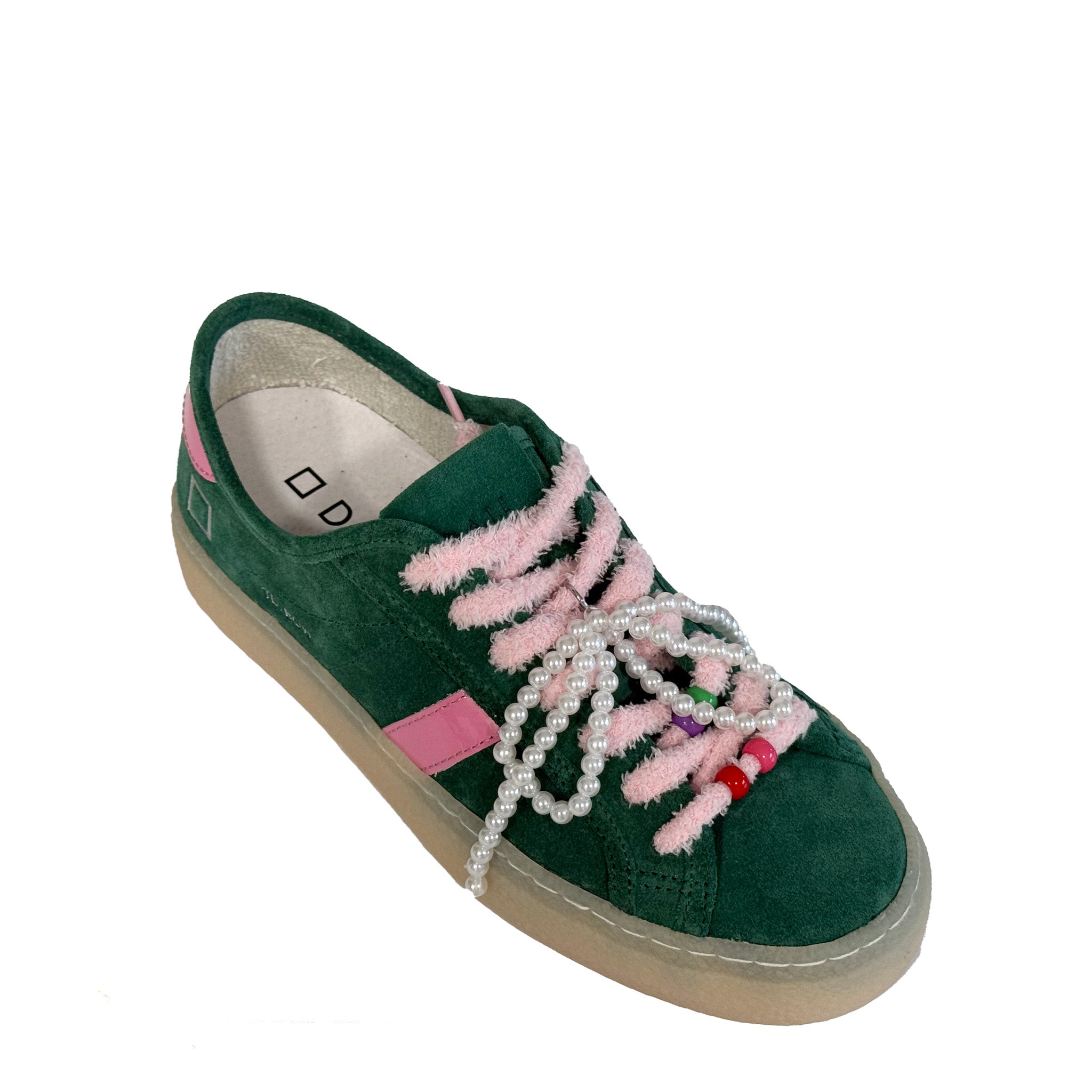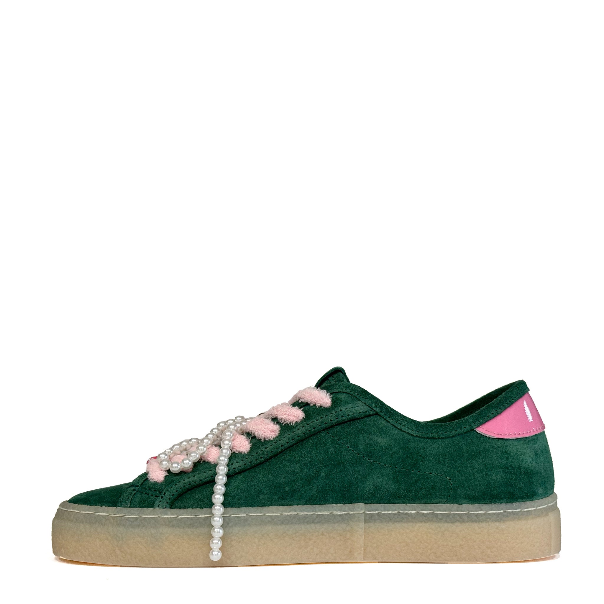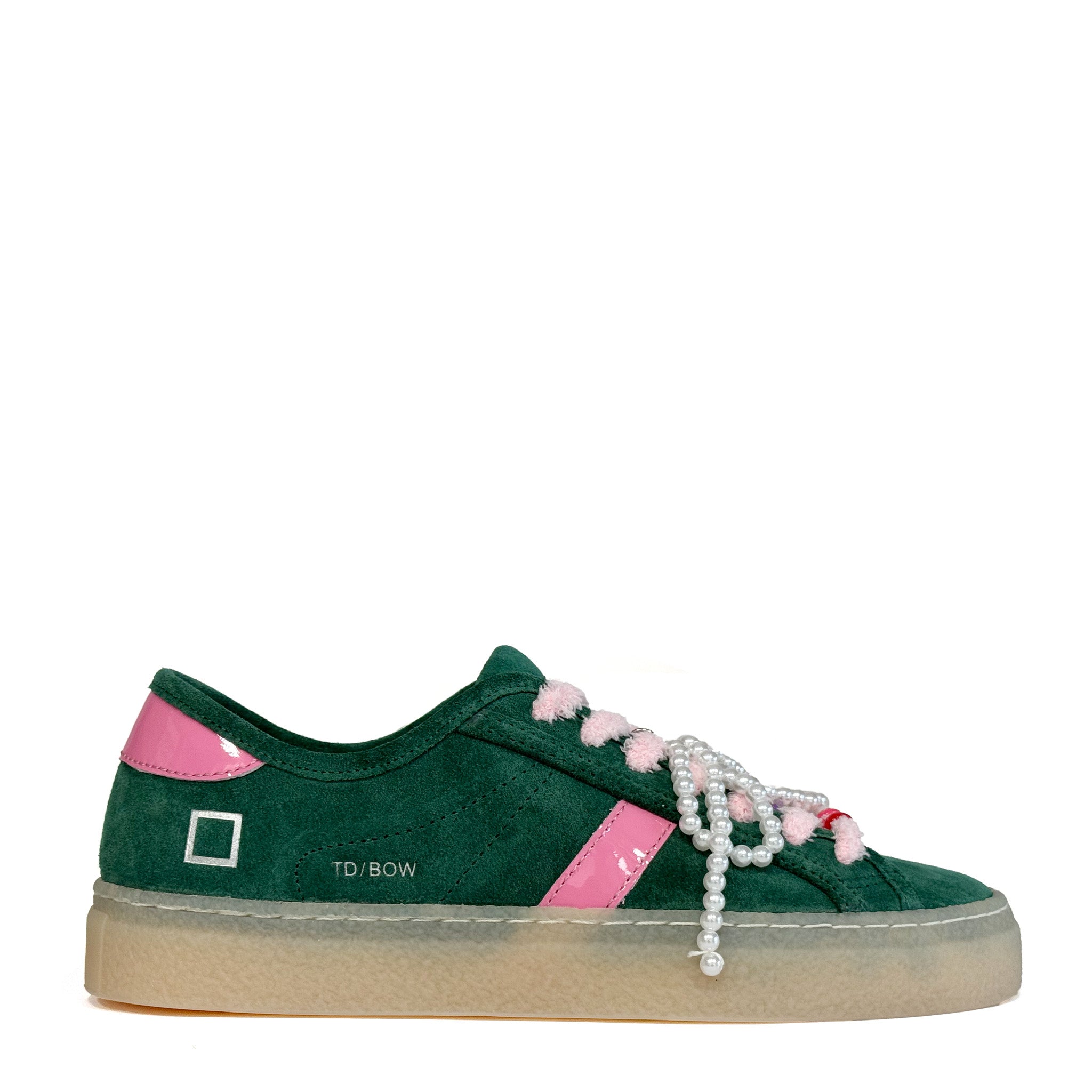 Le sneaker D.A.T.E. TENDER BOW Green uniscono stile contemporaneo e dettagli raffinati, perfette per chi ama distinguersi con eleganza. Realizzate in pregiata pelle scamosciata verde, si caratterizzano per i delicati inserti rosa che aggiungono un tocco femminile e ricercato al design.
