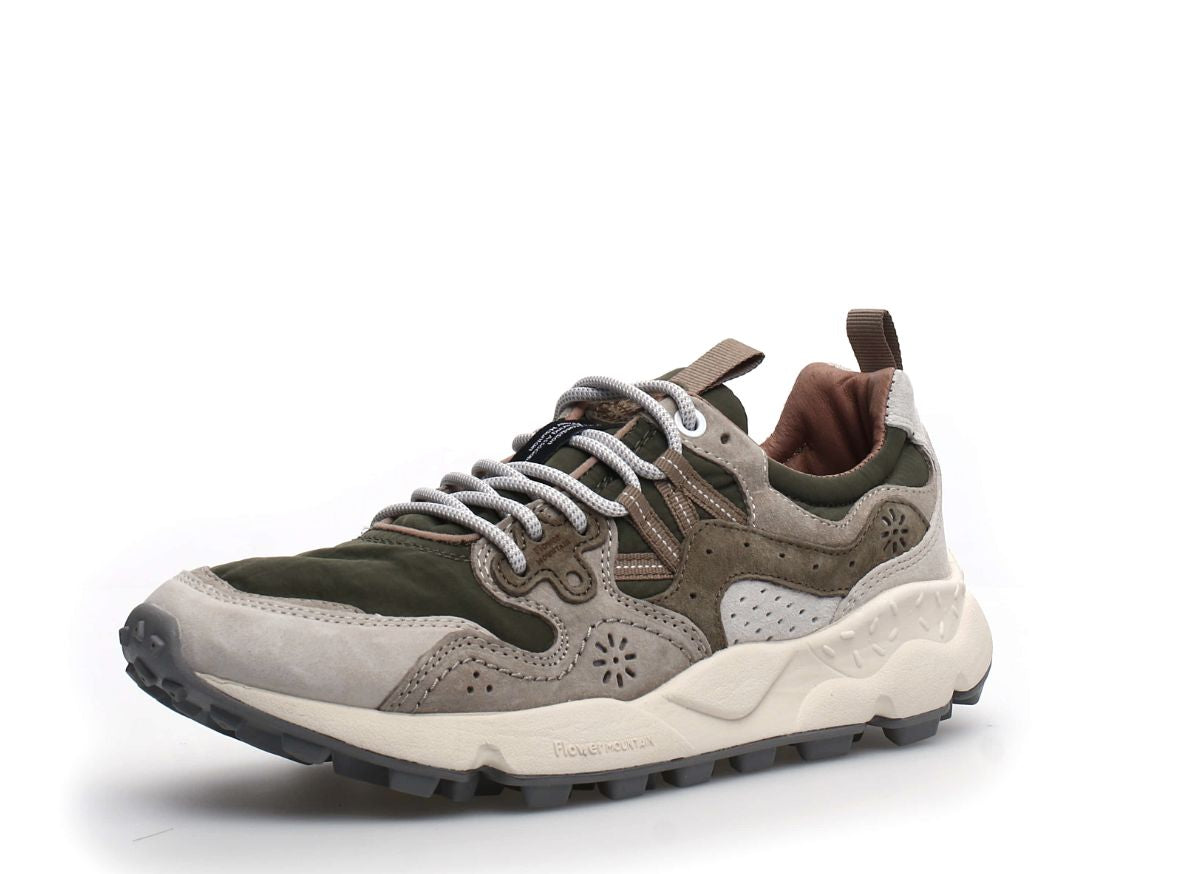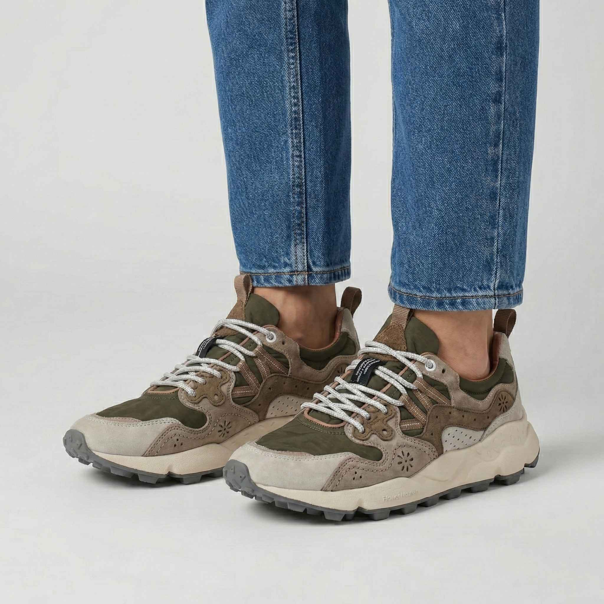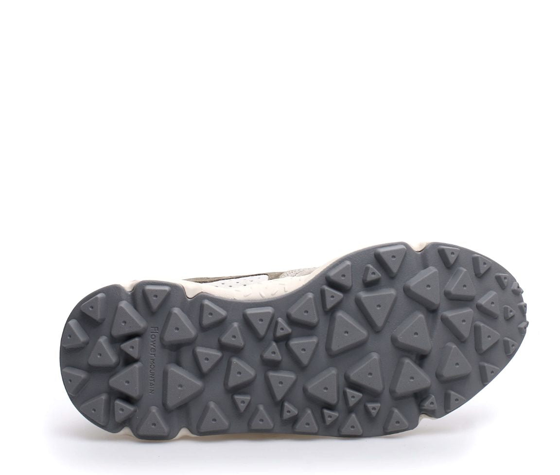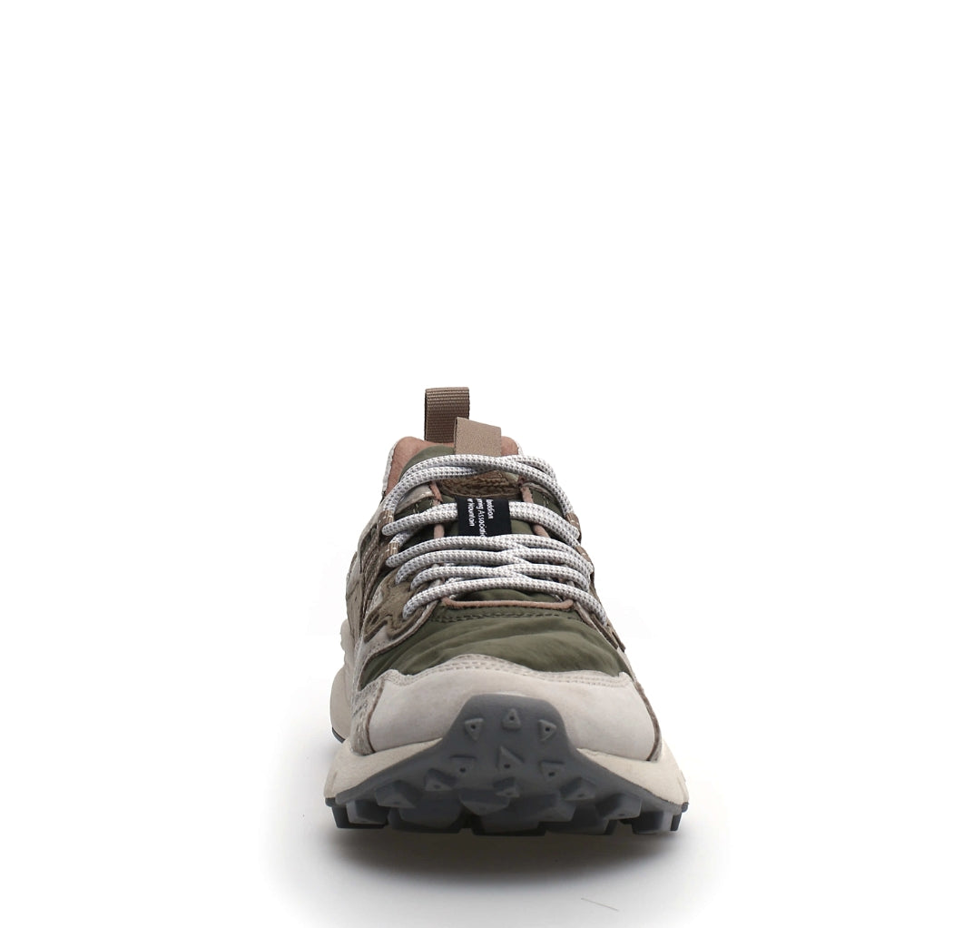 Sneaker sportiva con tomaia in tessuto e inserti overlapping in suede multicolor. Chiusura con stringhe trekking bicolori e occhielli dalla sagomatura floreale. Fodera in tessuto e pelle, con soletta interna in sughero naturale antibatterico. Fondo in gomma ultra leggera con sagomature e battistrada dentellato.