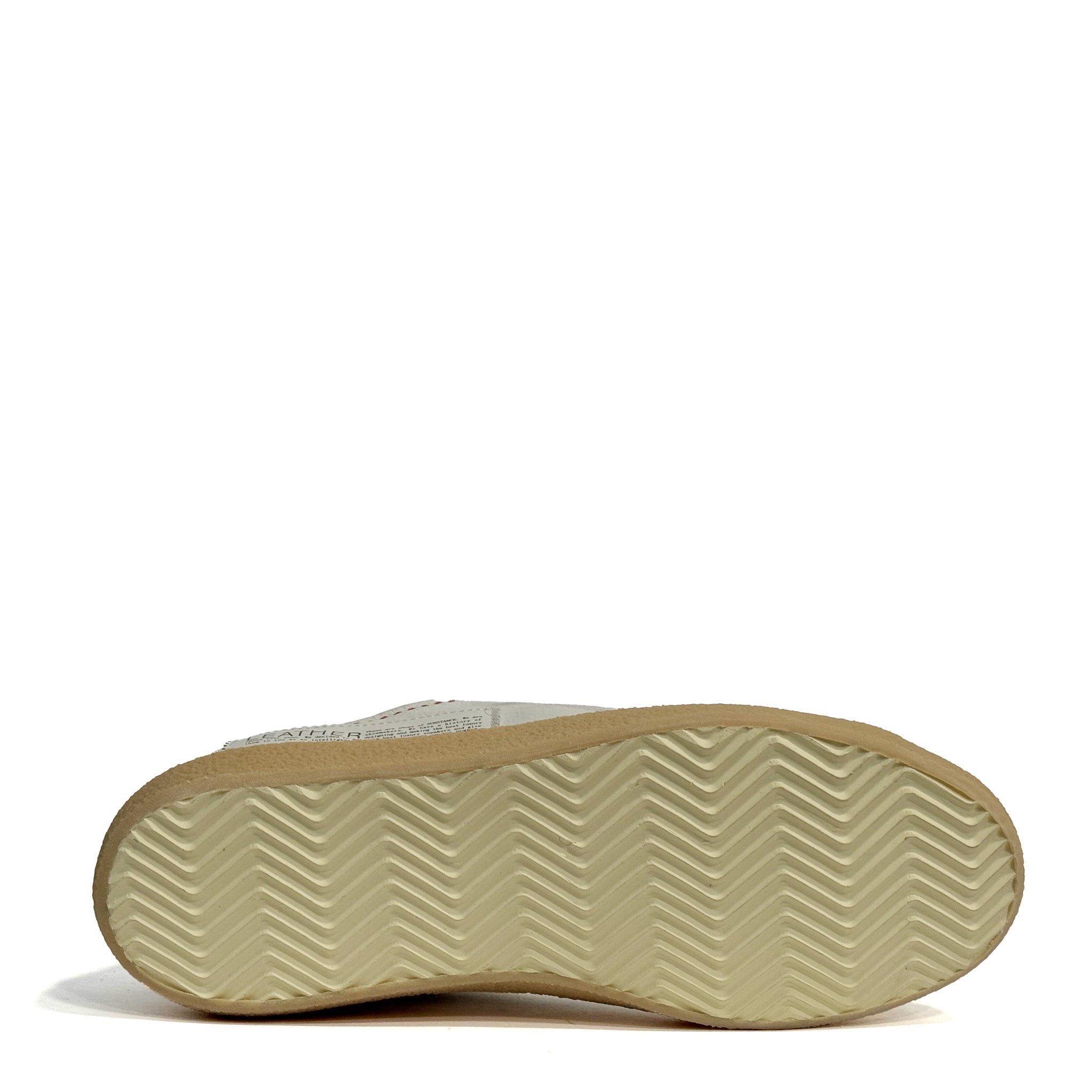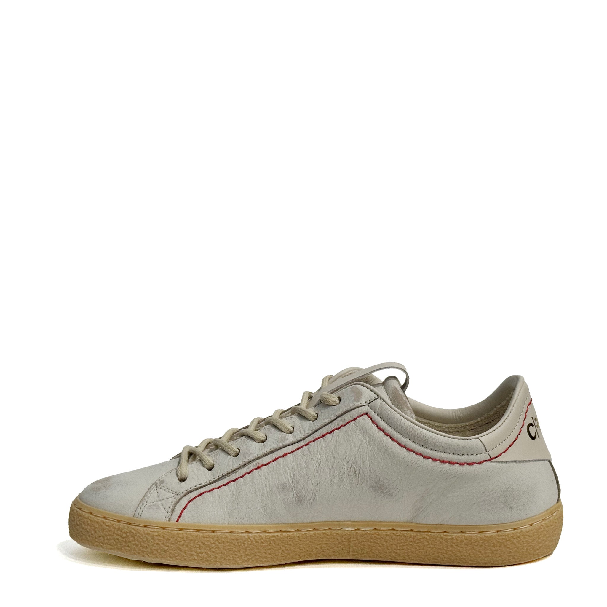 Tomaia in pelle bianca invecchiata con cuciture rosse distintive