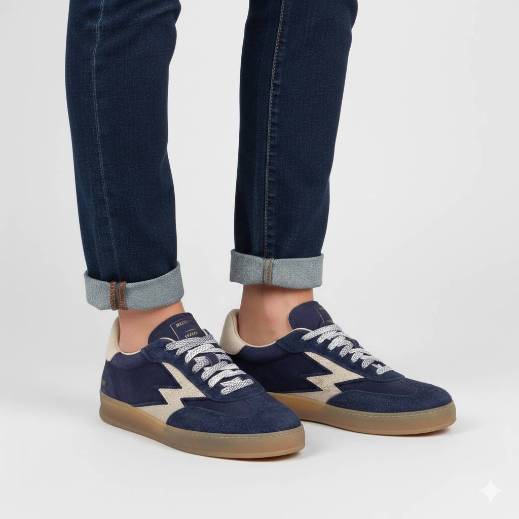 Il logo stampato in suede bianco sporco si integra armoniosamente con le tonalità del modello, mentre la linguetta in nylon blu e la linguetta posteriore in pelle bianco sporco completano il look con contrasti equilibrati e raffinati. La suola in gomma color miele, con un’altezza di 3,4 cm, garantisce comfort, stabilità e ottima aderenza per l’uso quotidiano.
