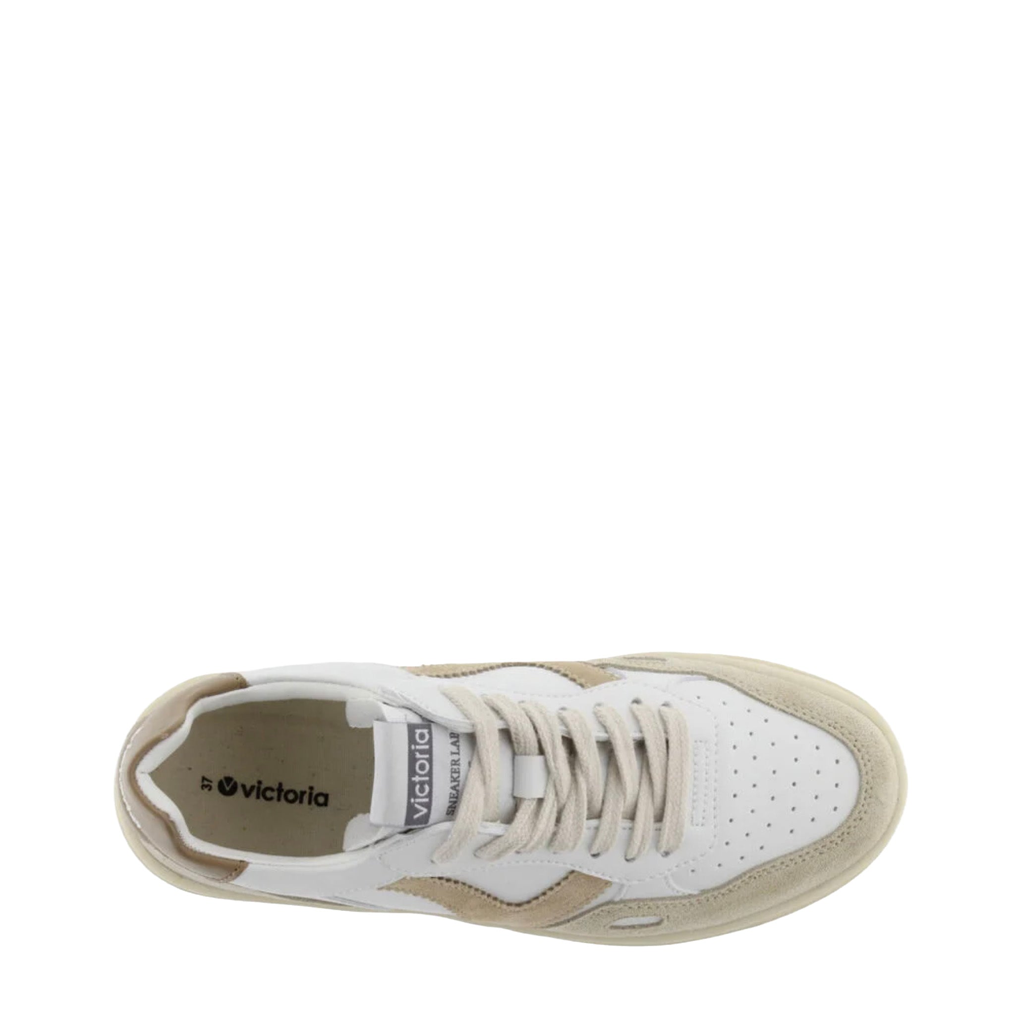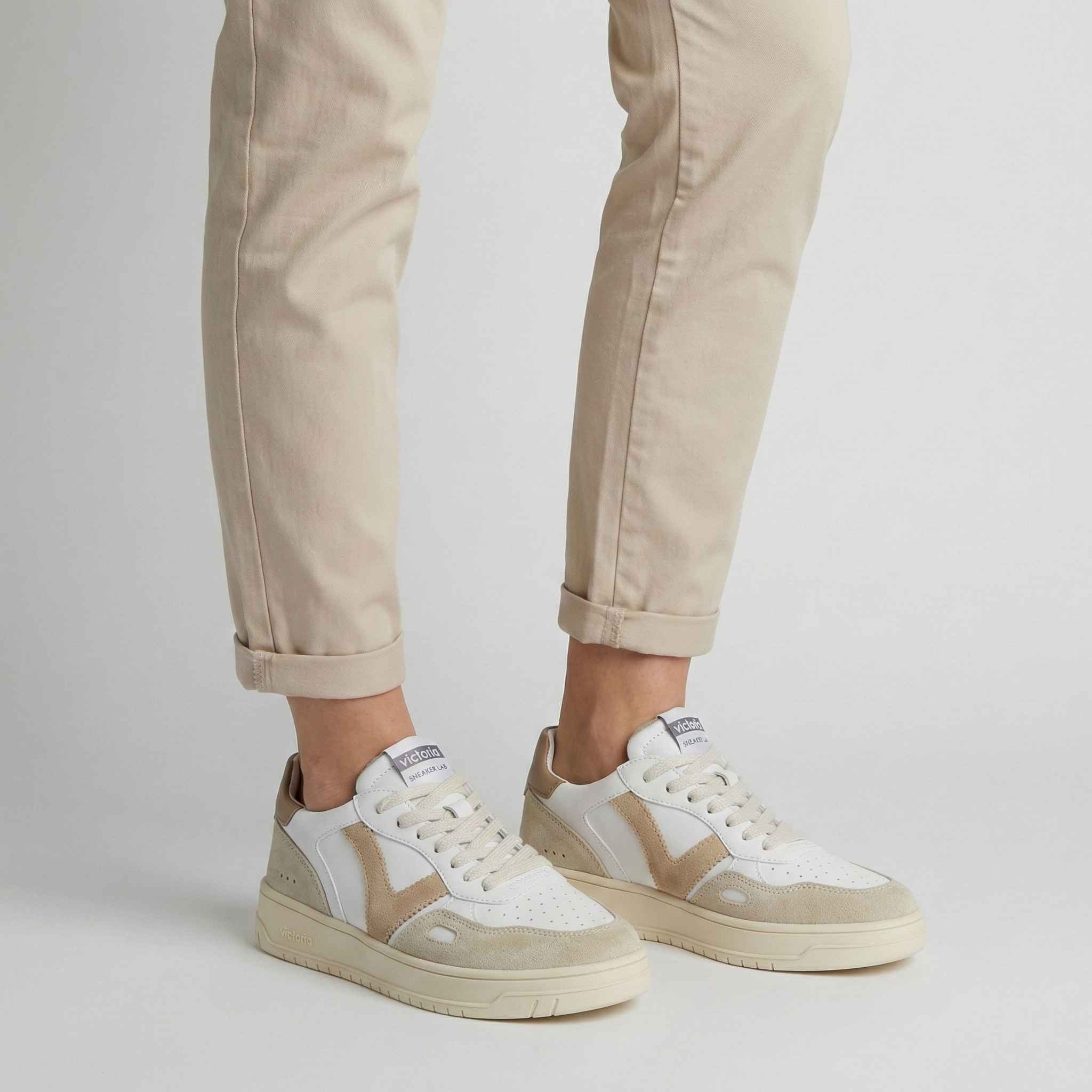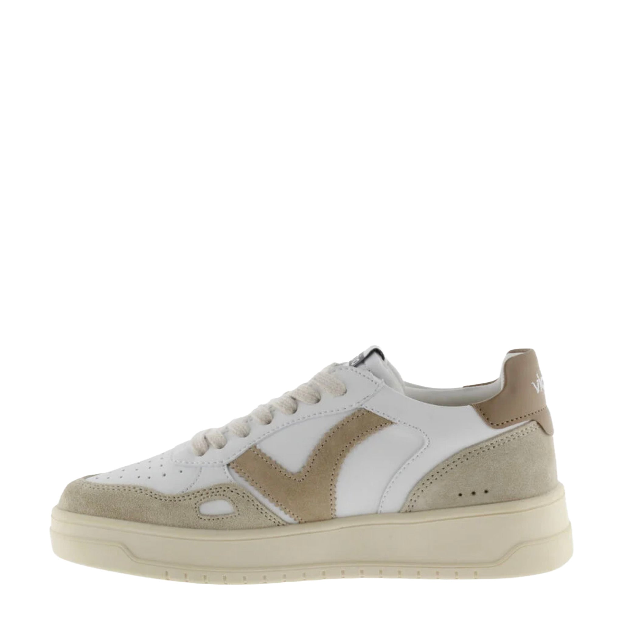 La tomaia bianca è arricchita da inserti colorati e dettagli in effetto camoscio, che creano un contrasto dinamico e contemporaneo. La distintiva V laterale firmata Victoria si abbina cromaticamente al tallone e al logo del brand, per un look coordinato e riconoscibile.