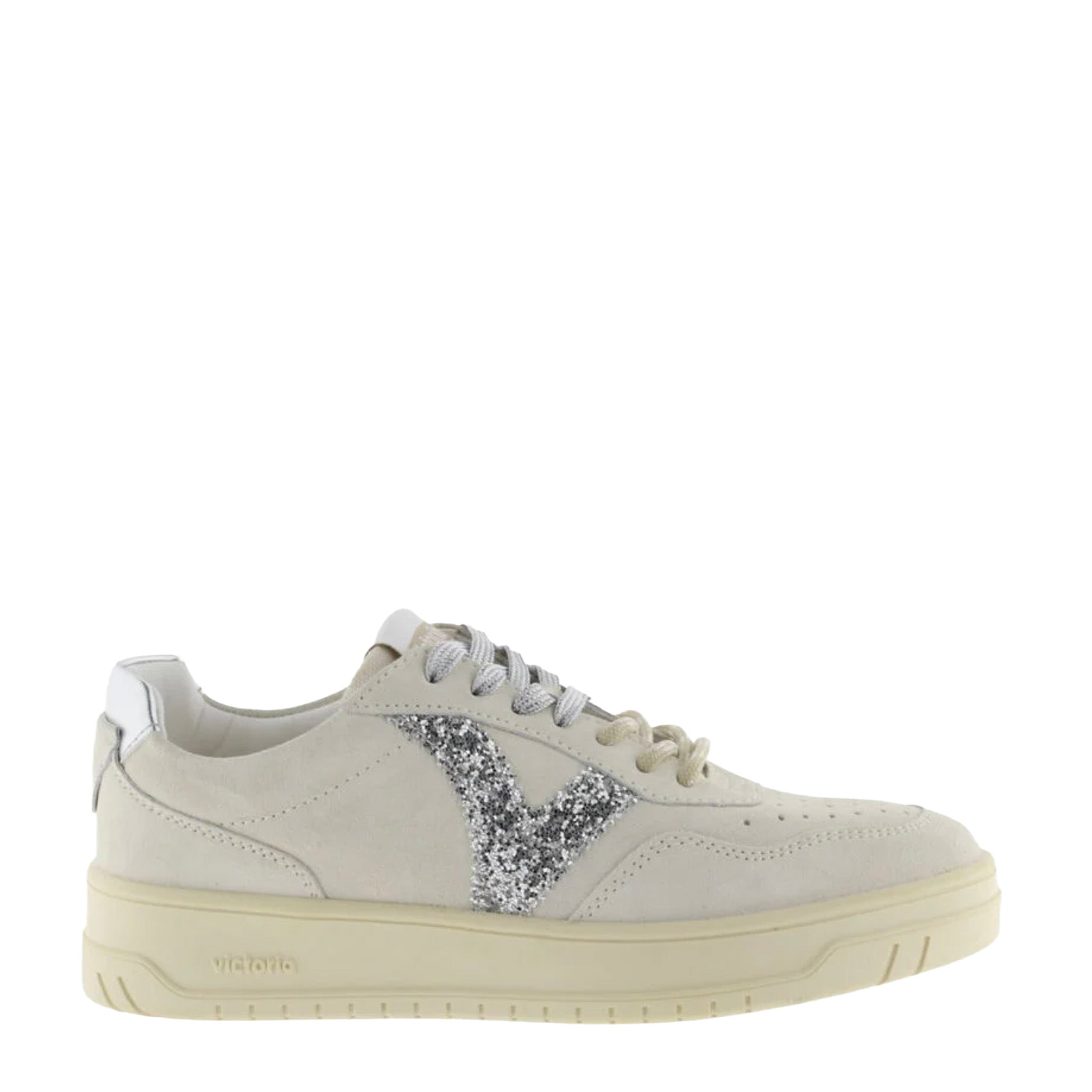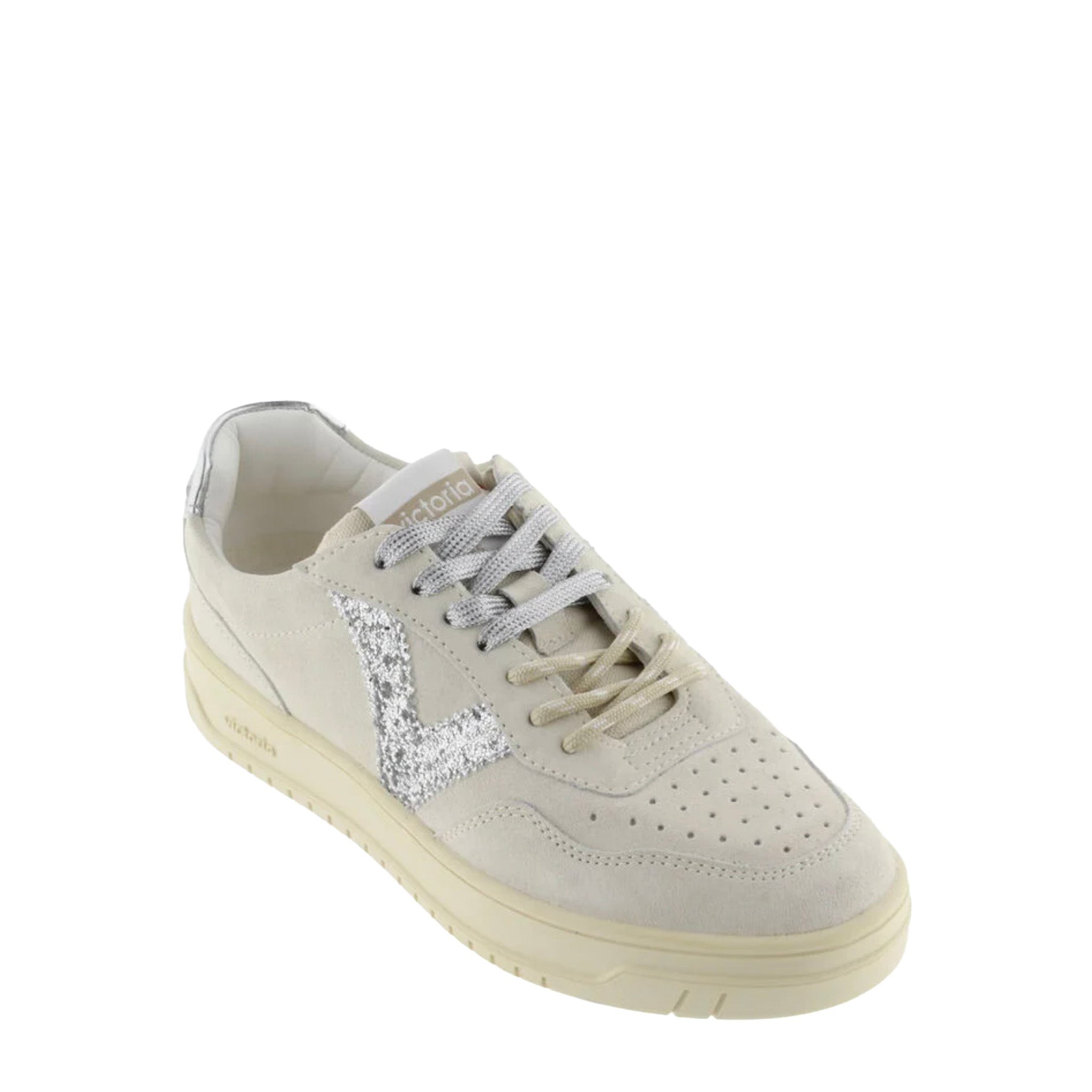 Le scarpe sportive da donna in effetto camoscio combinano eleganza casual e dettagli glamour, perfette per valorizzare ogni look urbano con un tocco brillante e contemporaneo. La tomaia morbida è impreziosita dall’iconica V laterale firmata Victoria in glitter, che dona luminosità e carattere al modello. Il tallone metalizzato crea un raffinato contrasto, aggiungendo un accento moderno e femminile. Il design è arricchito dalla chiusura con doppio laccio: un paio con delicato effetto metallico per un look più glam e un paio rotondo tono su tono per uno stile più minimal e versatile, ideale da personalizzare in base all’outfit.La punta traforata favorisce la traspirazione, garantendo freschezza durante tutta la giornata, mentre la suola in TPR leggermente ambrata assicura flessibilità, resistenza e un leggero effetto vintage di tendenza.