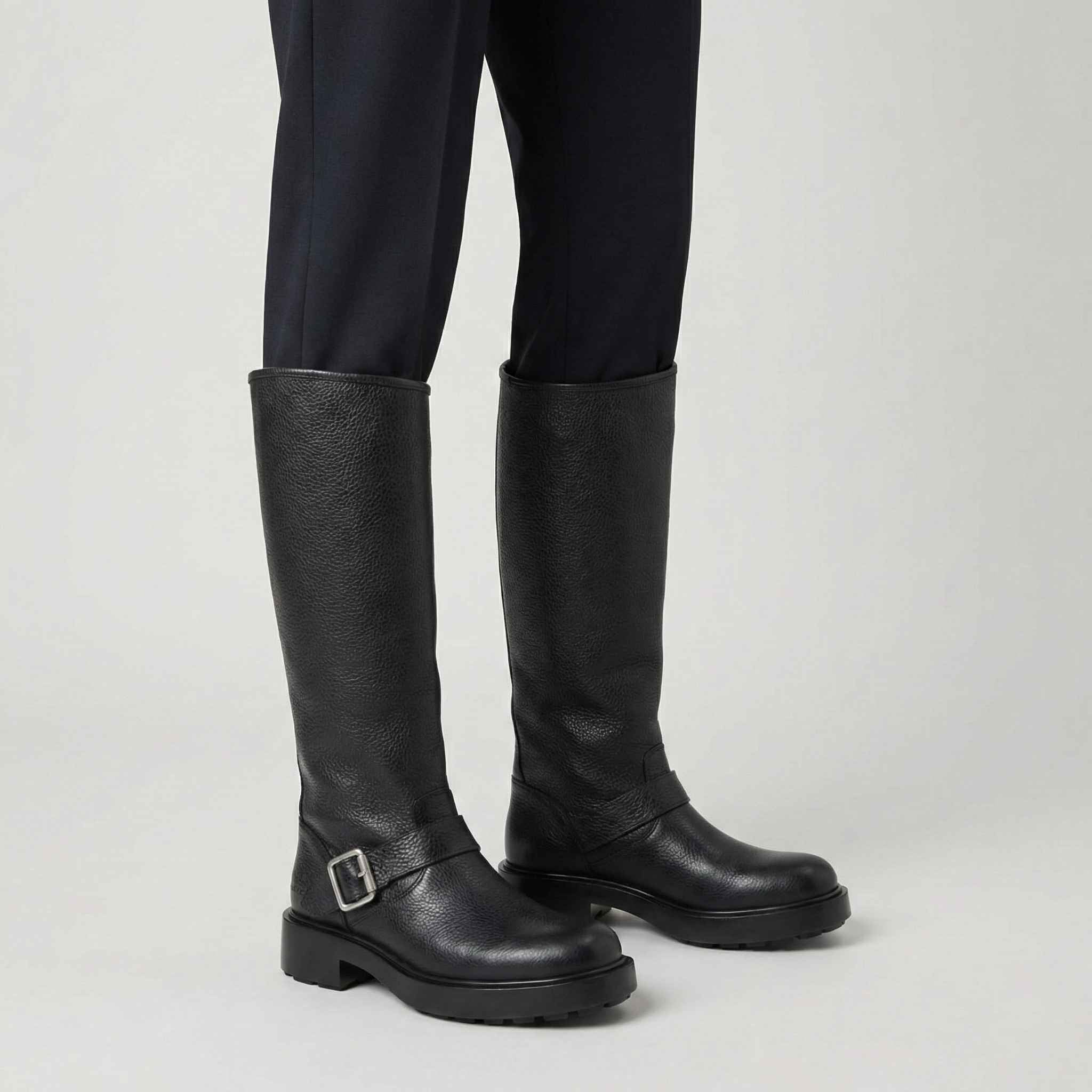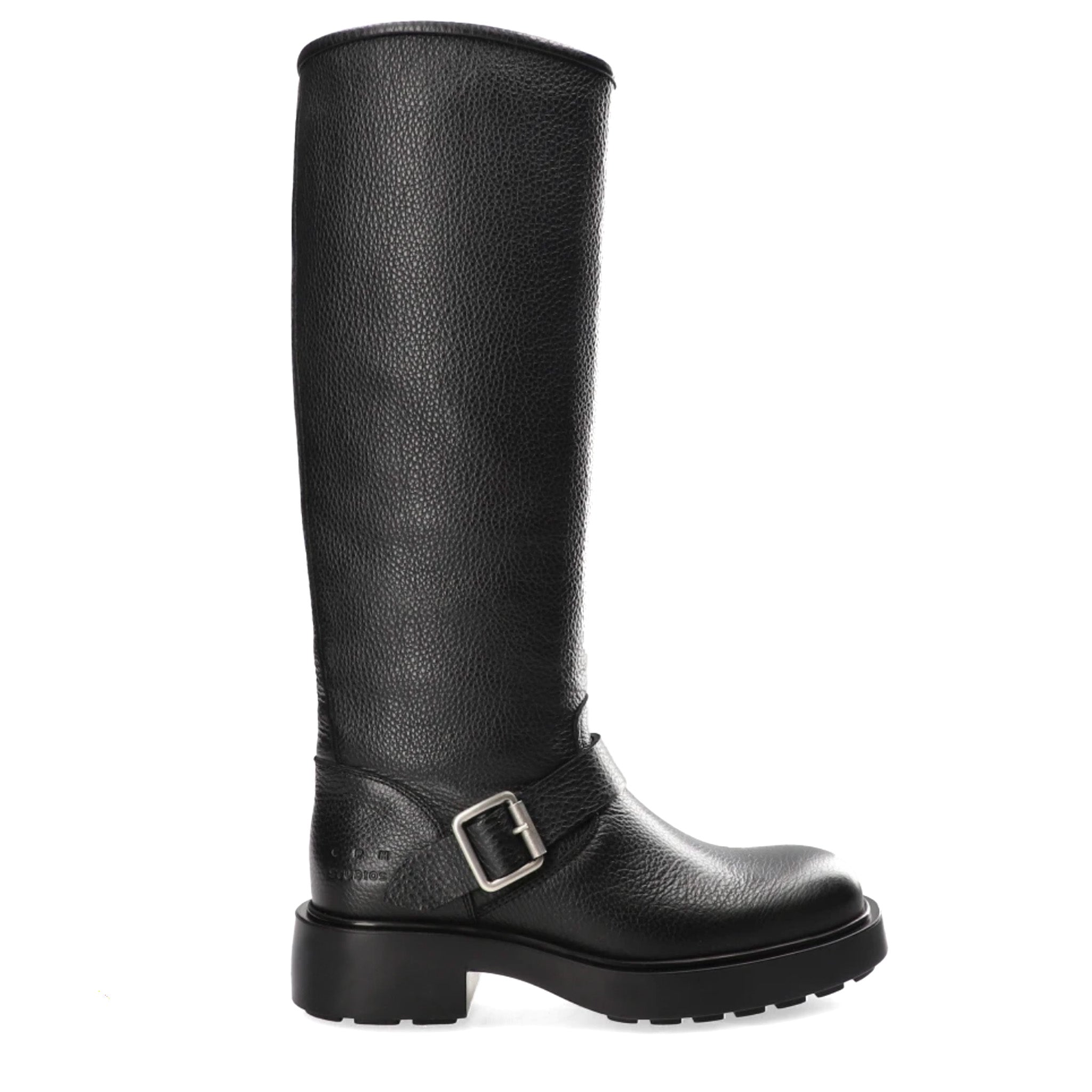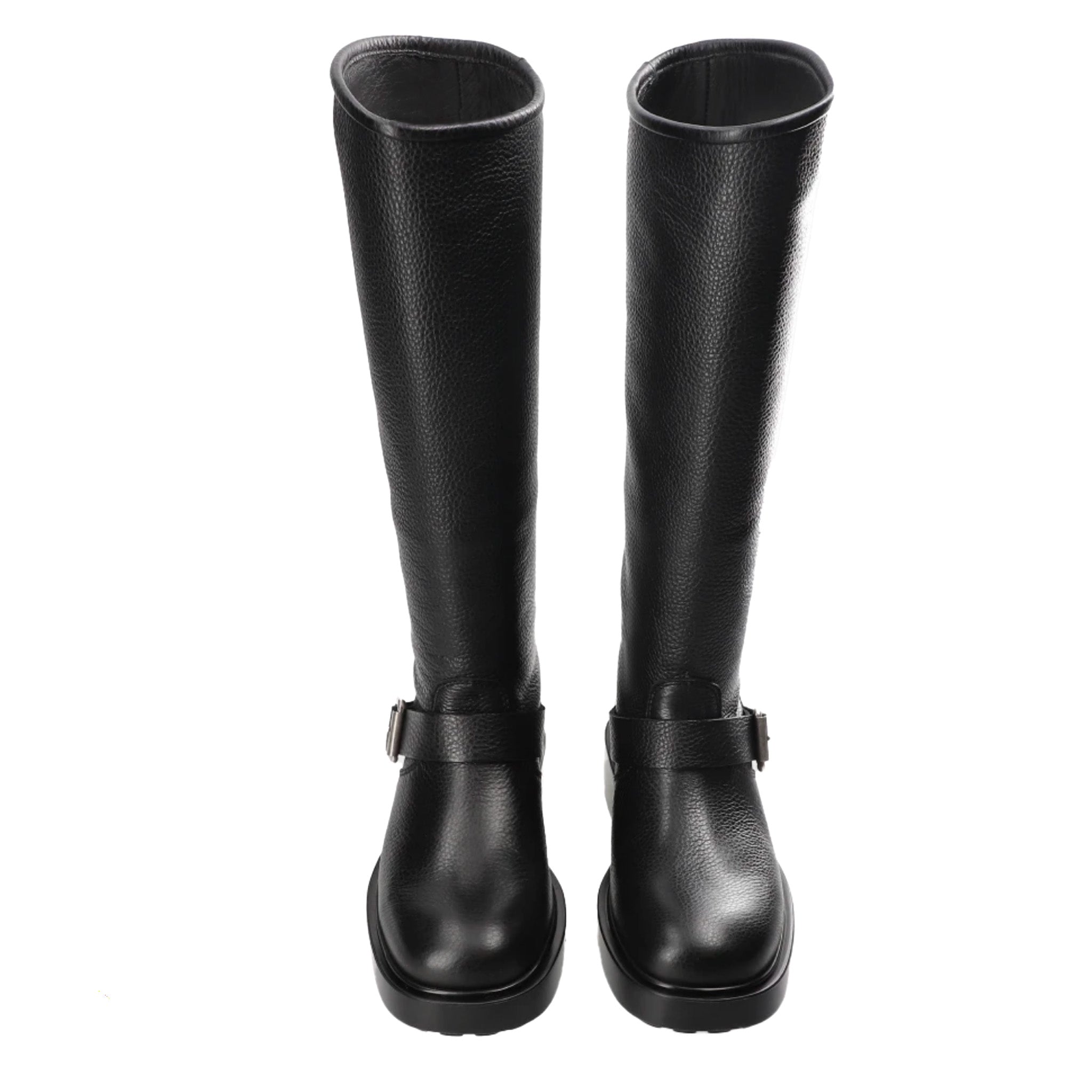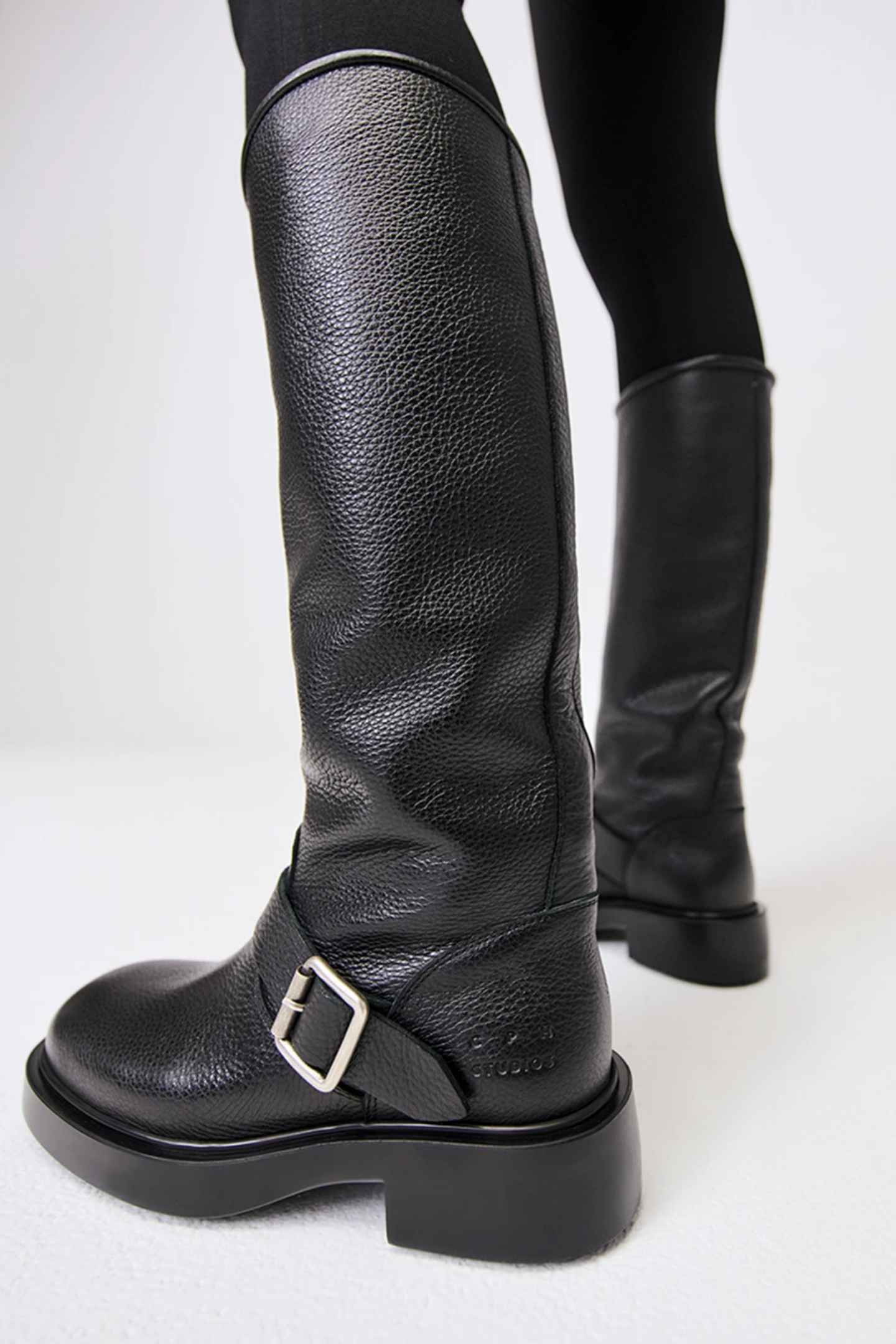 Linee pulite, un look sorprendente: questi stivali alti da motociclista enfatizzano la purezza delle forme, senza dettagli superflui. La pelle liscia è impreziosita da una sottile fibbia argentata e da un piccolo logo all'esterno. La punta ha un aspetto delicatamente spigoloso, moderno, sobrio e di ispirazione nordica.