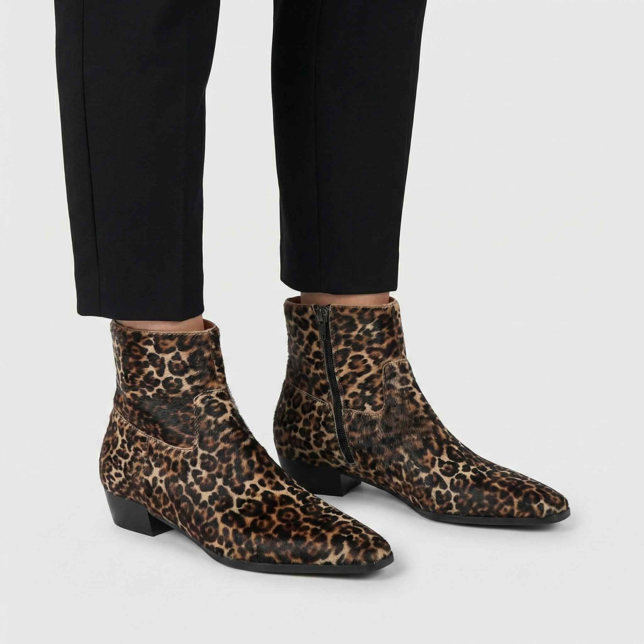 Unisce linee raffinate e personalità audace, lo stivaletto nero con stampa leopardata è pensato per chi desidera distinguersi con stile. La silhouette elegante si fonde con una punta finemente lavorata, mentre la pelle italiana con texture effetto pelo dona profondità visiva e una sensazione tattile unica.