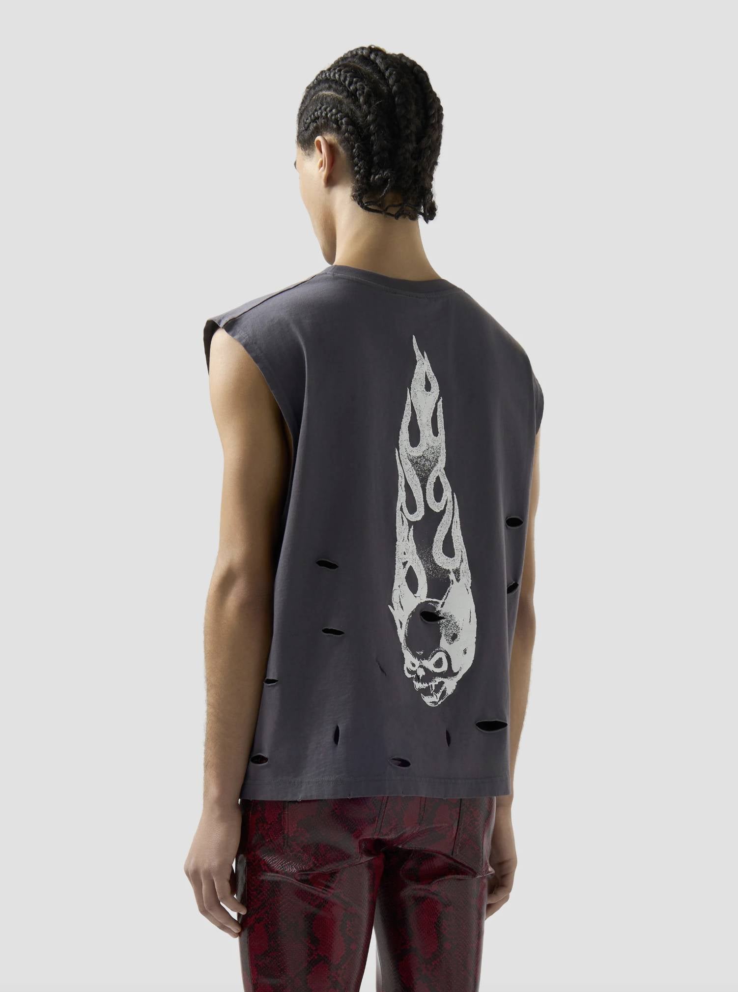 T-shirt senza maniche in cotone con stampa “Riders” effetto used sul davanti. Il design presenta grafiche di teschi e fiamme sulla parte frontale, con logo GCDSWEAR integrato nella composizione. Il modello è completato da scollatura girocollo e vestibilità regolare.