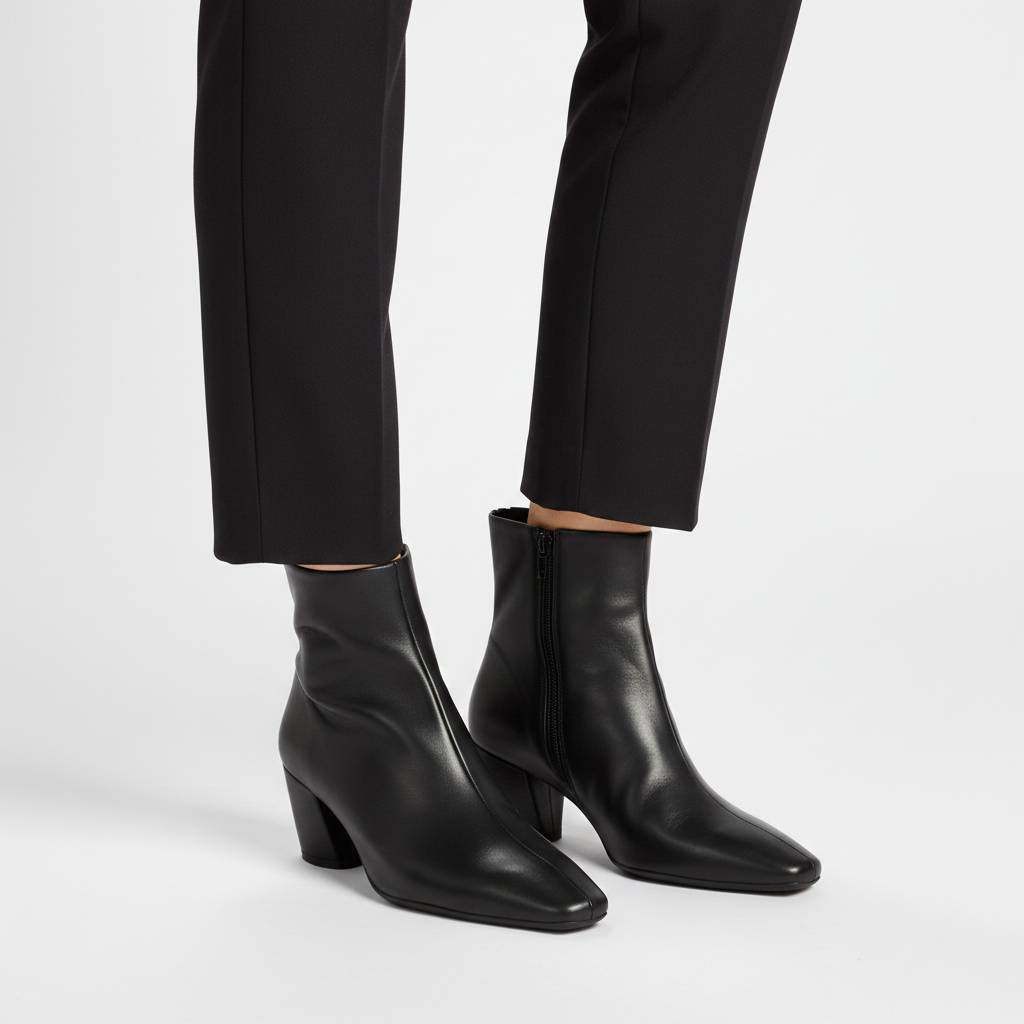 Tronchetto in vera pelle liscia nera, fondo in vera pelle, cerniera sul retro. Altezza tacco 5 cm.