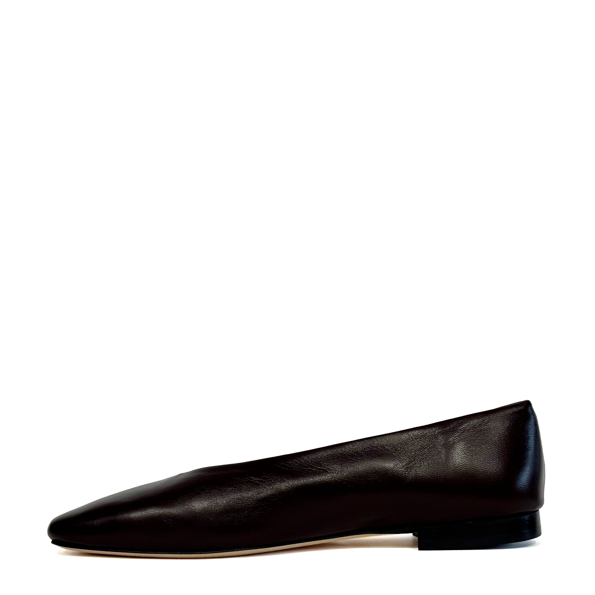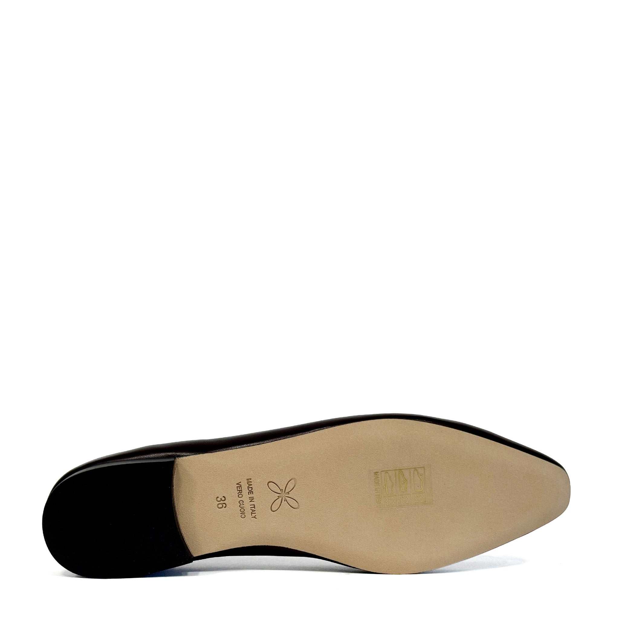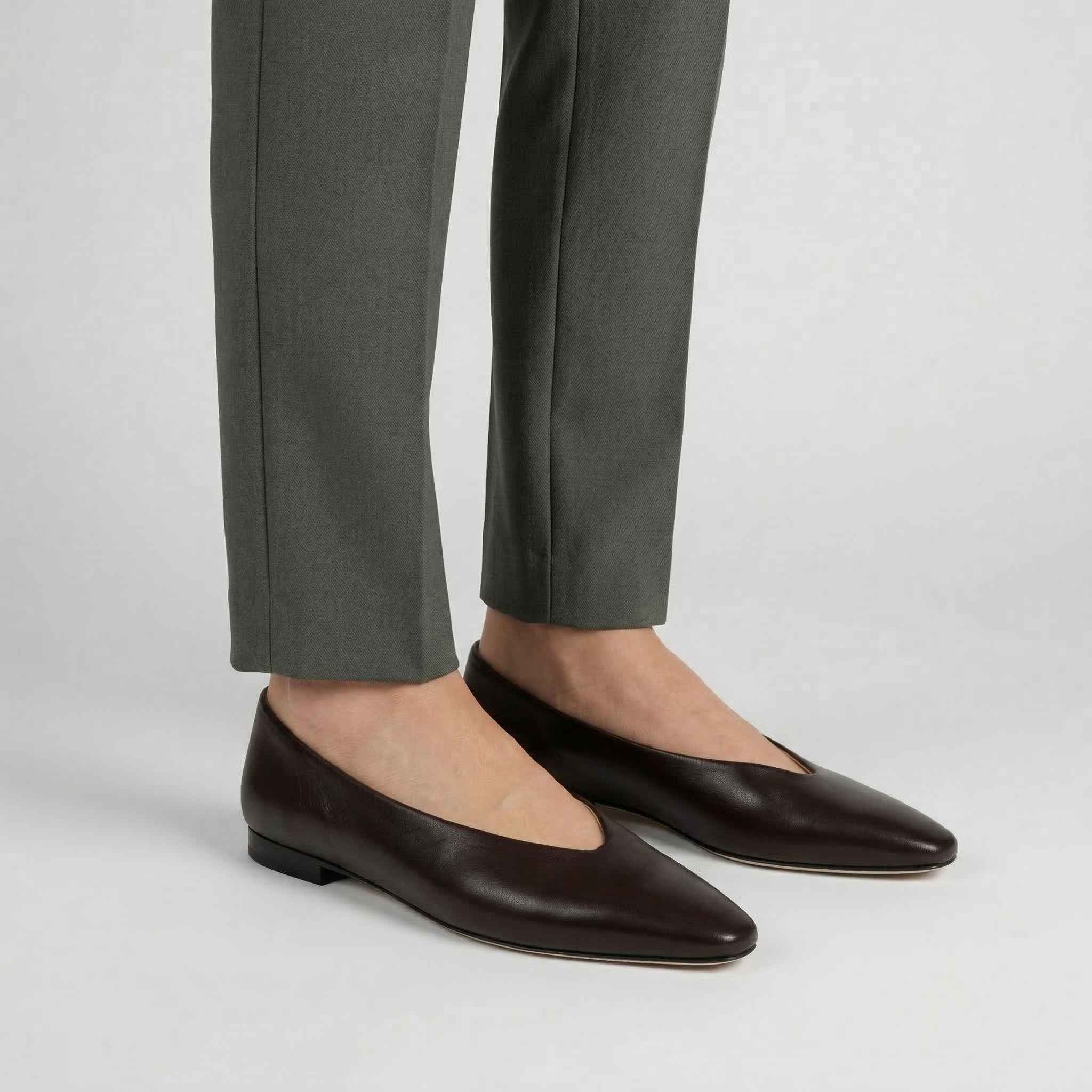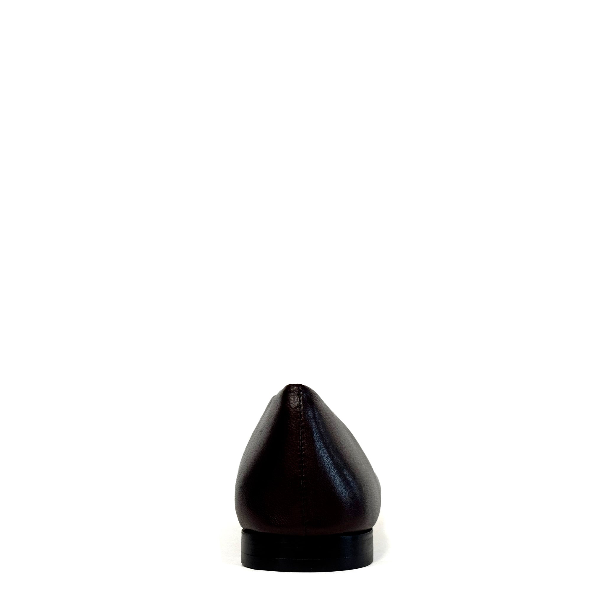 Tomaia in pelle liscia color cioccolato con punta squadrata.