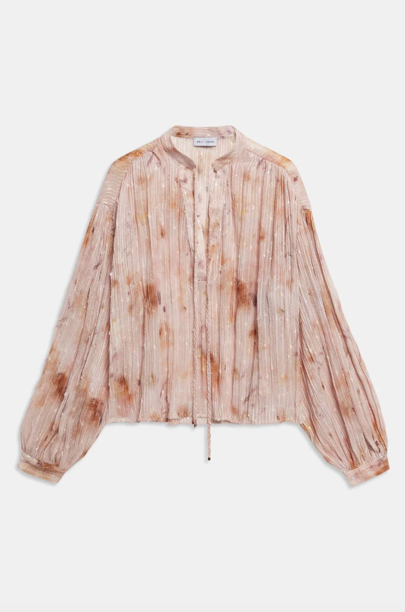 Blusa in tessuto plissettato con paillettes, ampio scollo a V, passamaneria lavorata tono su tono e fit leggermente oversize.