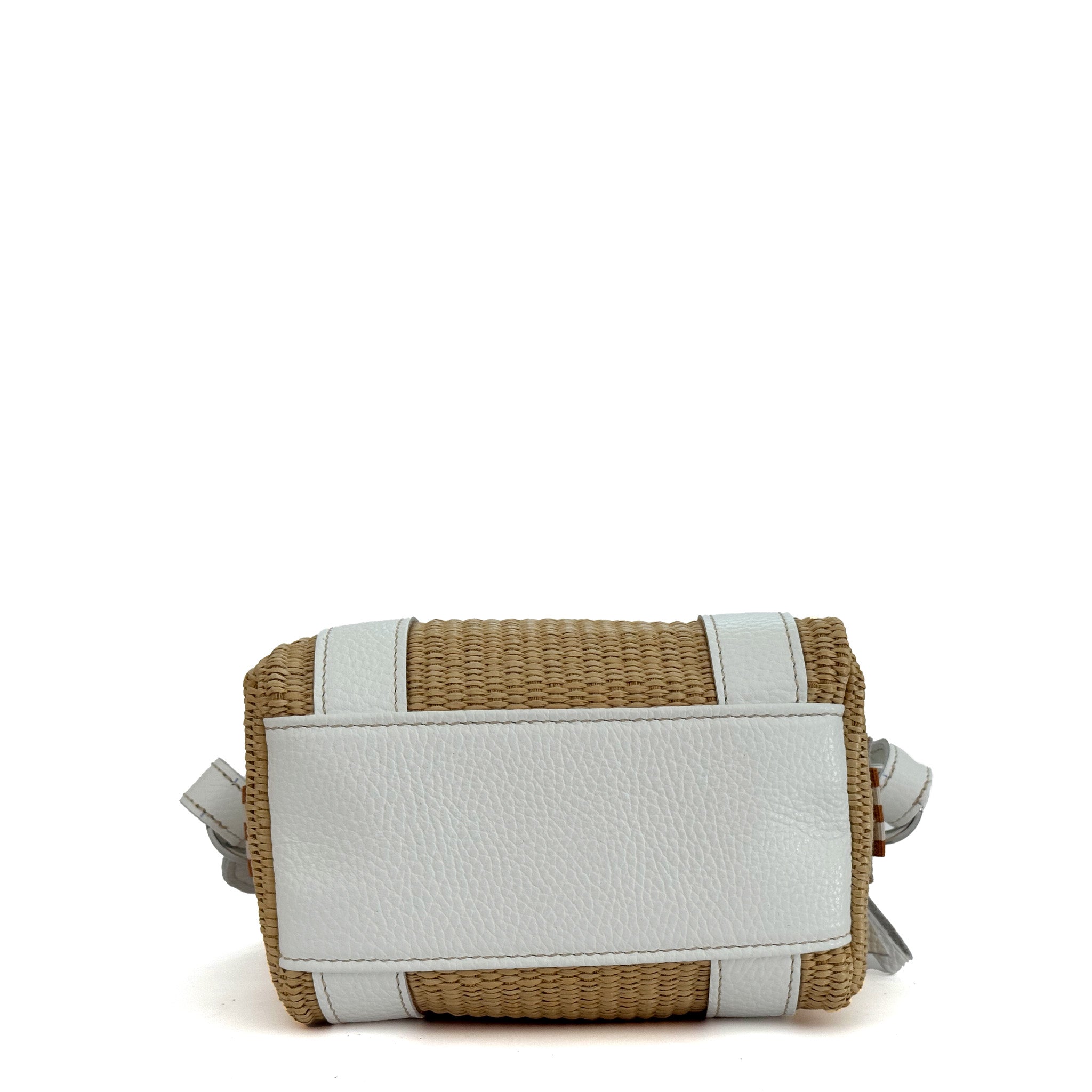 Le dimensioni contenute (17x14x11 cm) la rendono ideale come borsa da giorno o per il tempo libero, offrendo praticità e organizzazione grazie a quattro tasche interne. La tracolla regolabile, larga 5 cm, è in nastro a righe avorio e caramello, con terminali in pelle e aggancio a gemello, per un tocco di freschezza e stile contemporaneo.