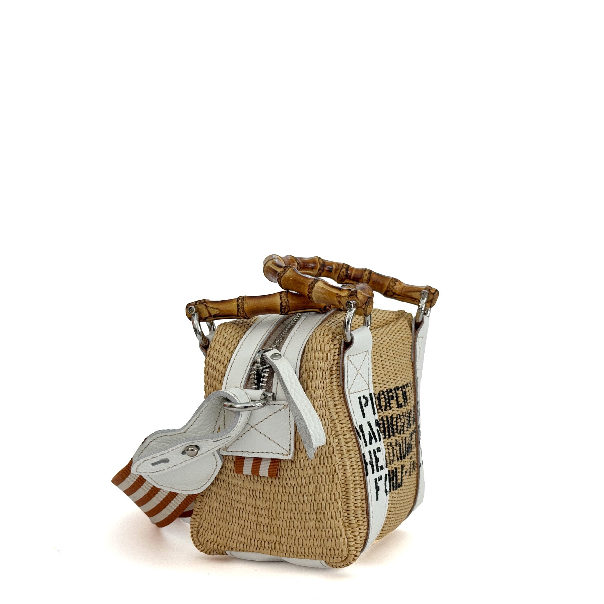 BB CAPRI è una borsa artigianale compatta ma capiente, realizzata in pura paglia naturale e pelle martellata di alta qualità, con manici in autentico bamboo naturale curvato a caldo. Un mix di materiali pregiati che dona un look elegante e originale, perfettamente in linea con lo stile inconfondibile di MANIKOMIO DSGN.