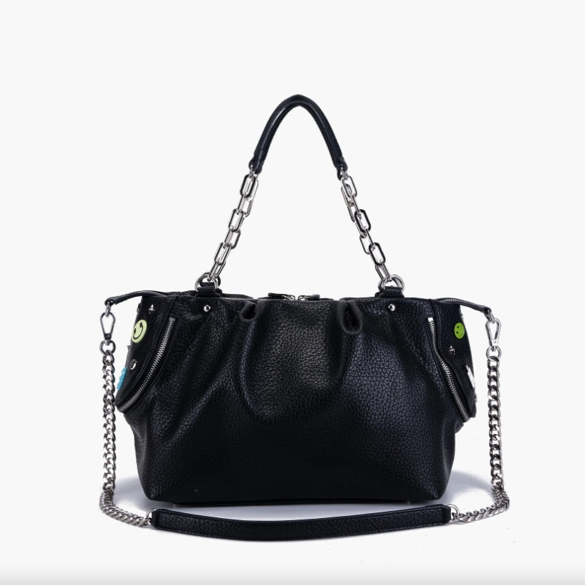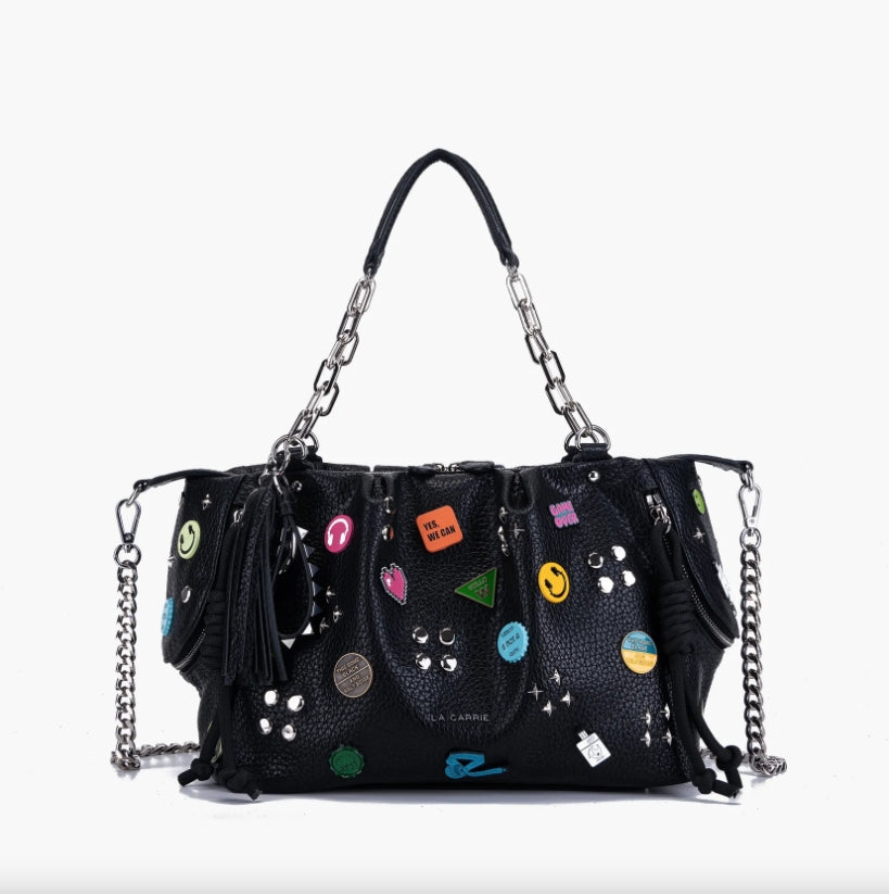 Borsa shopping con doppi manici in ecopelle martellata, con spille colorate applicate e chiusura a zip