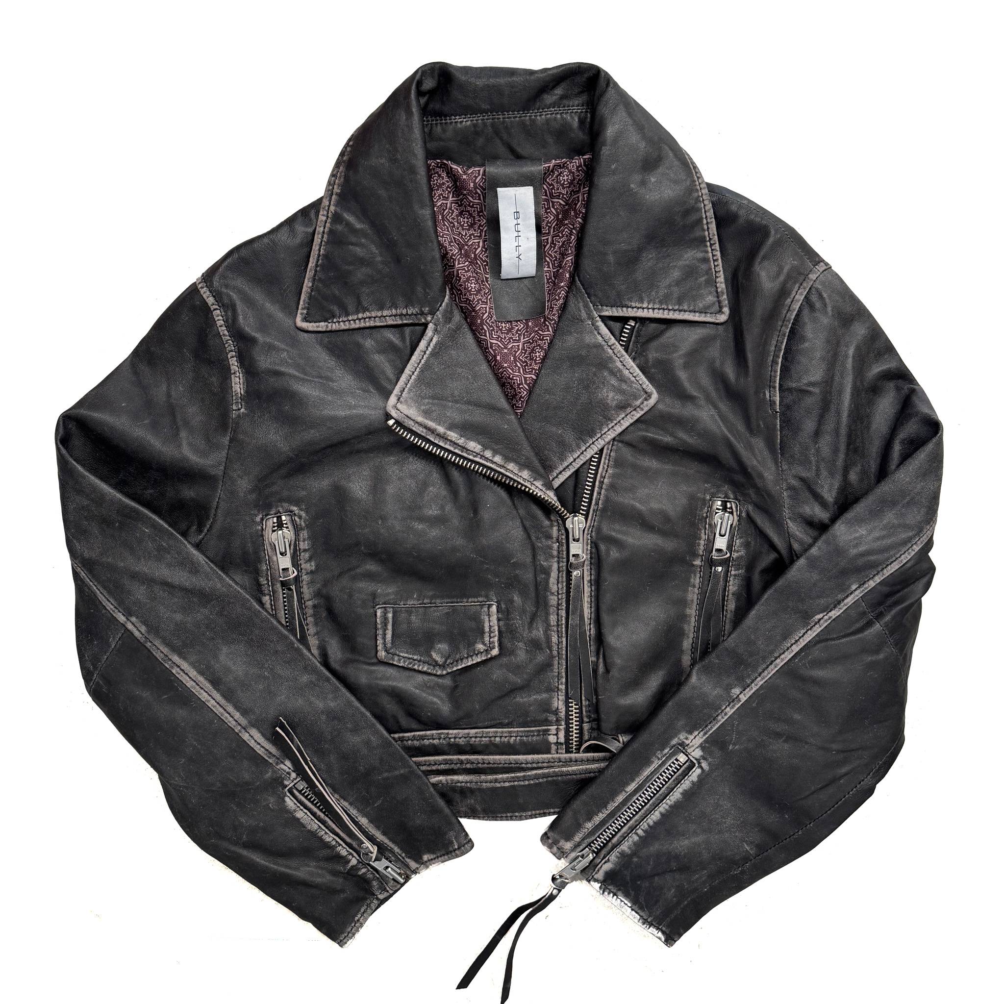 Chiodo in pelle liscia color carbone, effetto invecchiato