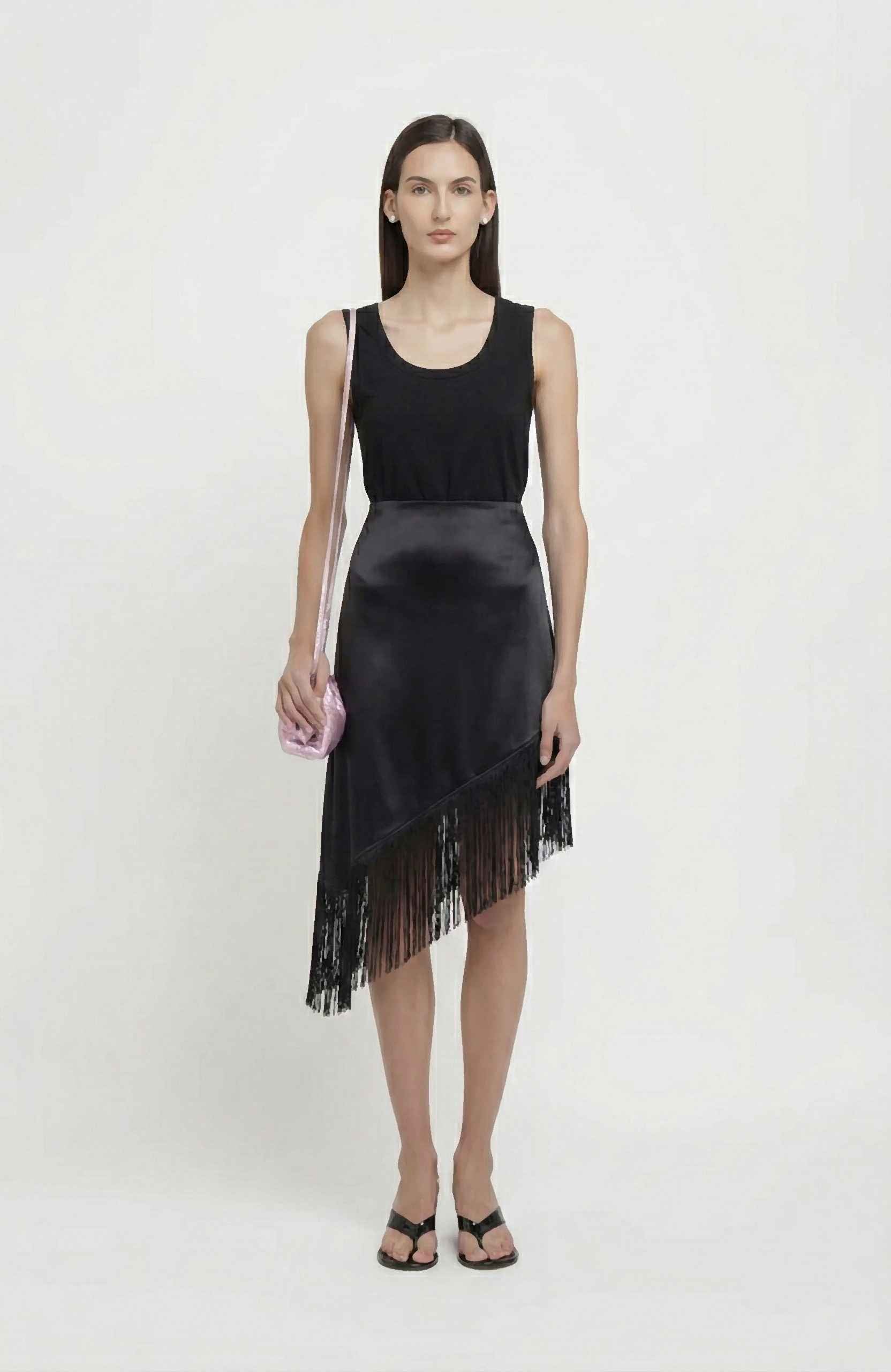 Gonna midi in gabardina con taglio asimmetrico sul fondo e dettagllio frange.