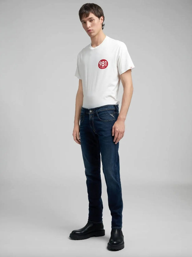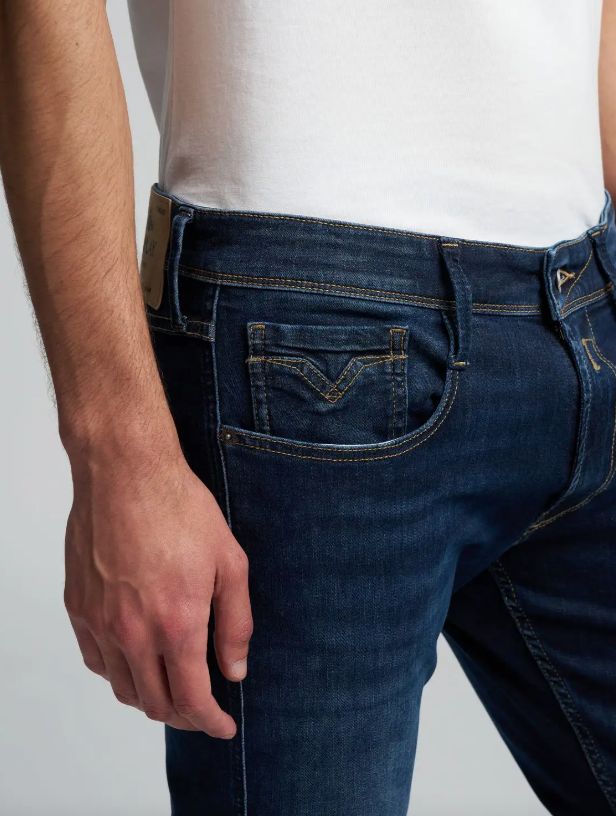 Jeans slim fit con vita regolare e gamba sottile più affusolata verso il fondo. Il capo cinque tasche è realizzato in dark indigo power stretch denim di misto cotone 10 oz con lavaggio enzimatico in tono scuro e si distingue per i baffi e il carteggio eseguiti a mano che creano contrasti sulle zone d'usura. L'iconica cucitura ala di gabbiano caratterizza il quinto taschino le tasche posteriori, una delle quali è rifinita dal ricamo R. Chiusura con bottone e zip.