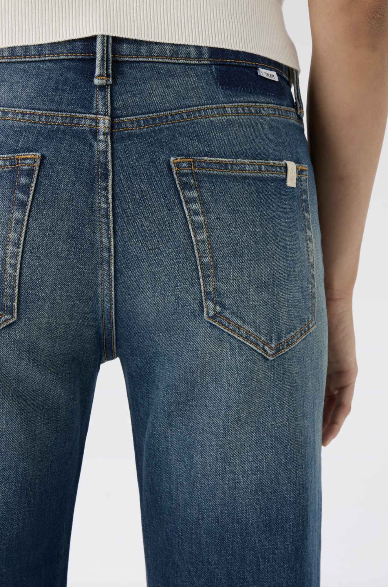 Un jeans che reinventa lo stile tomboy, con vita media e taglio dritto che offre il massimo comfort senza rinunciare alla personalità. La vestibilità morbida scende lungo le gambe, creando una silhouette rilassata ma definita.