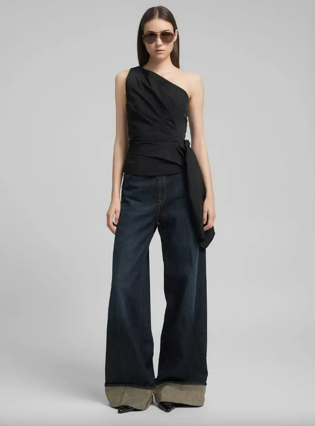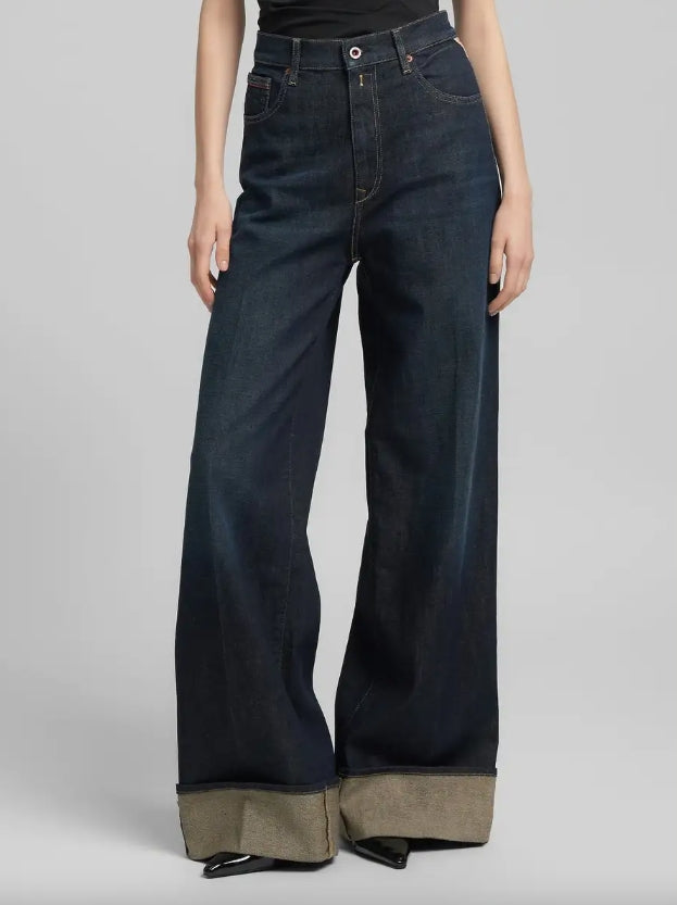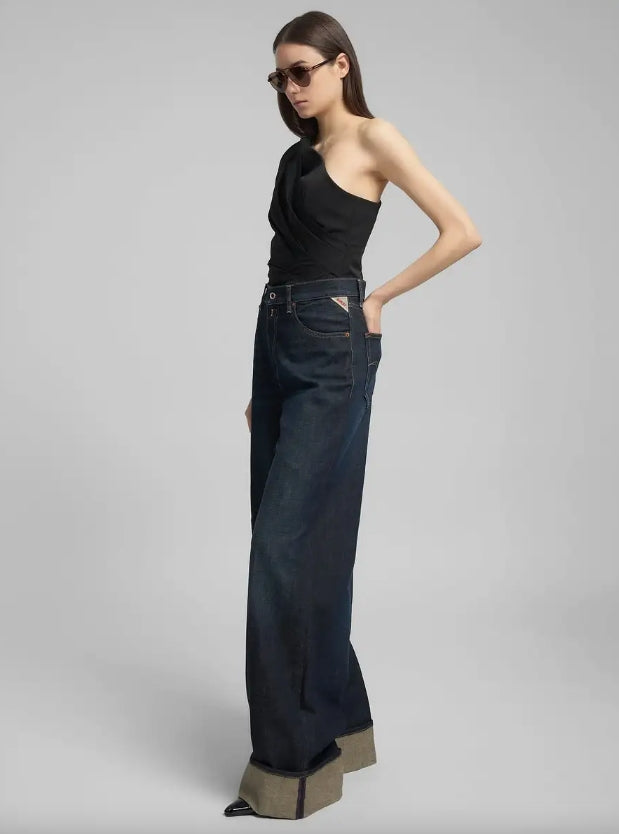 Jeans wide leg con vita bassa e gamba ampia con piega frontale stirata, per una vestibilità comoda e rilassata. Il capo cinque tasche è realizzato in deep blue indigo stretch denim di cotone 11,5 oz in tono di lavaggio scuro e presenta un trattamento con resinatura, leggera sporcatura finale e baffi e carteggio eseguiti a mano. L'iconica cucitura ala di gabbiano caratterizza le tasche posteriori, di cui una è rifinita dal ricamo R, mentre su una delle tasche frontali è presente un piccolo inserto personalizzato. Chiusura con bottone e zip.