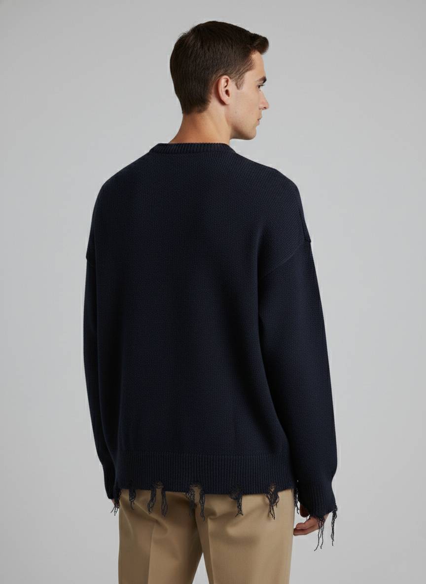 Il colore blu, elegante e versatile, si abbina facilmente sia a look casual che più curati. I dettagli sfrangiati sui polsini delle maniche e sul bordo finale aggiungono personalità al design, rendendo questo maglioncino un capo distintivo e di tendenza.