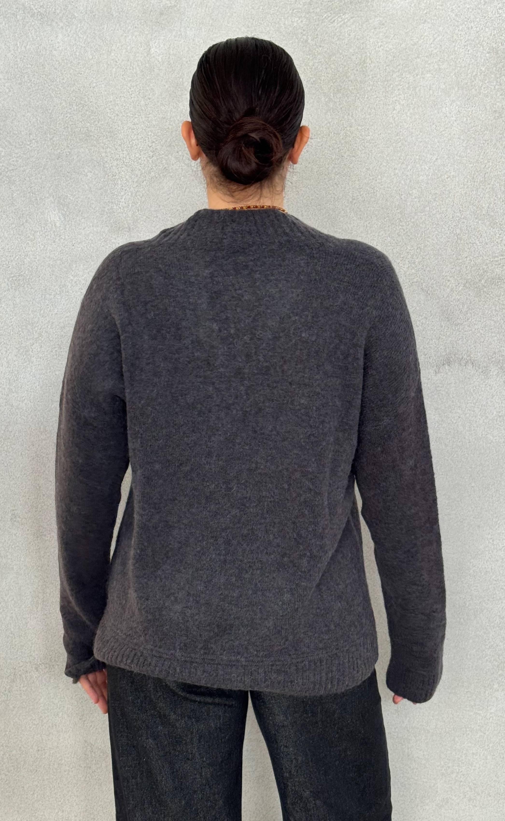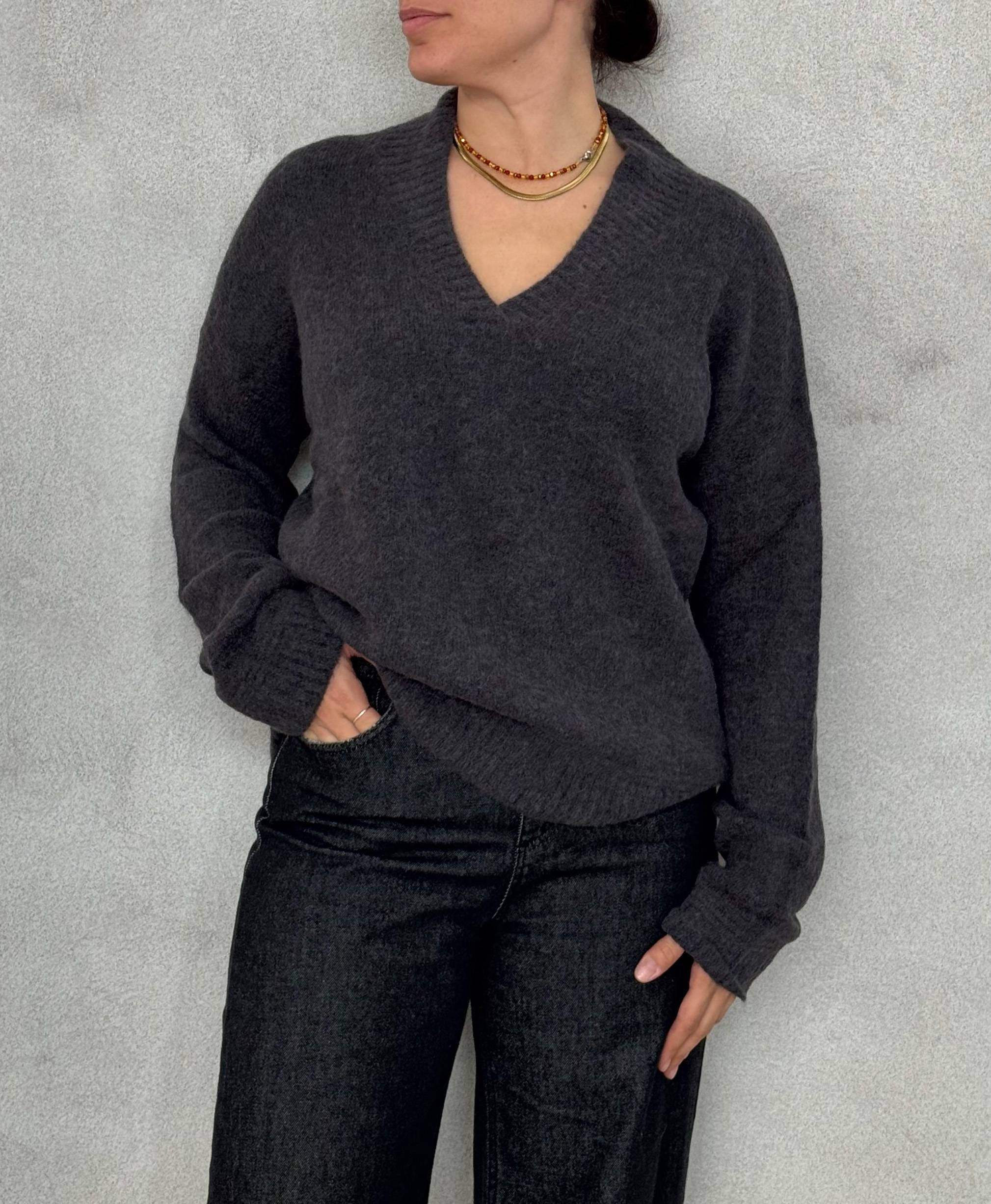 La nuance ardesia, un grigio freddo con sfumature blu, dona al capo un tocco contemporaneo e versatile, ideale per l’autunno e l’inverno. Lo scollo a V valorizza la linea del collo ed è perfetto da indossare da solo o sopra una camicia per uno stile più formale.