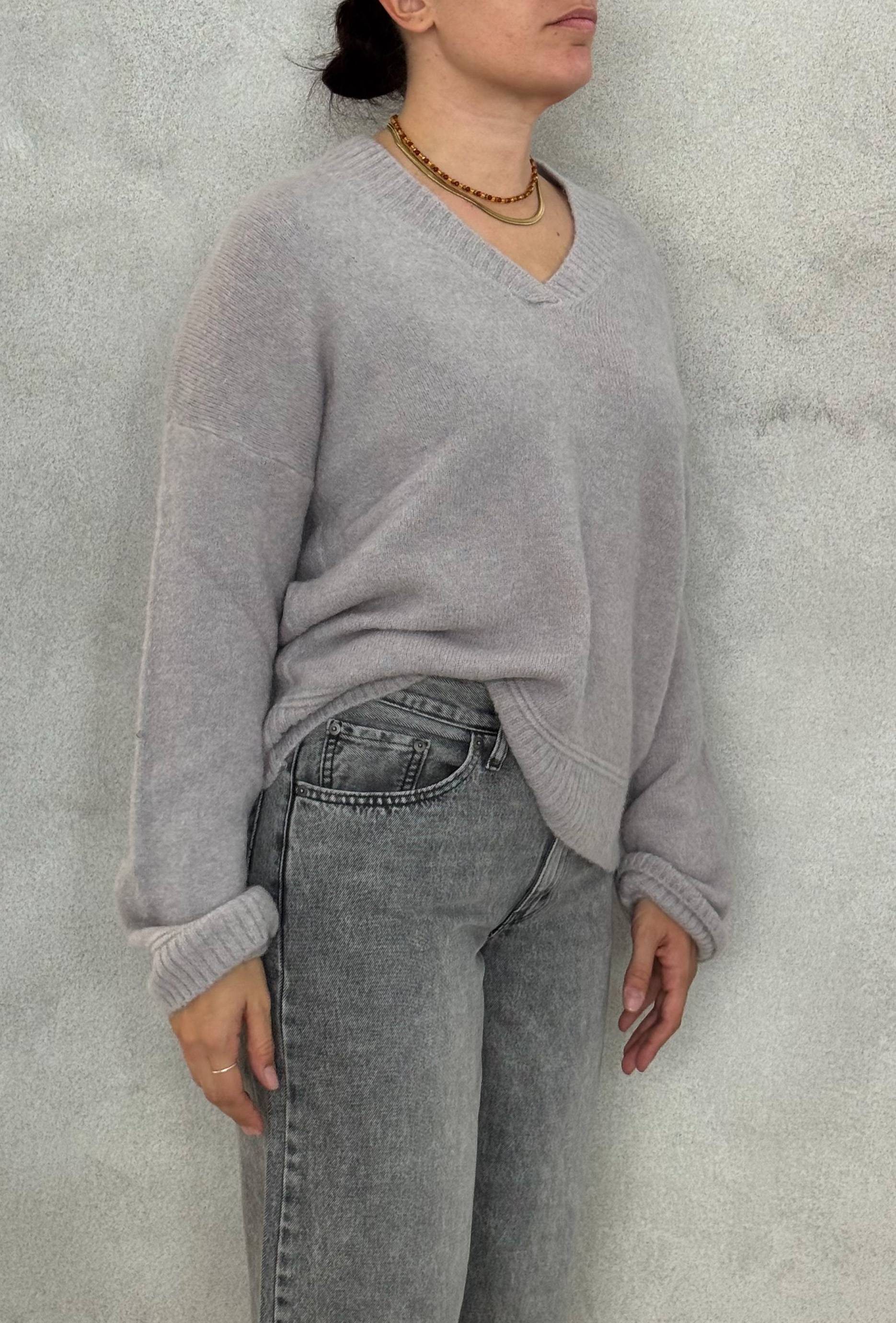 Lo scollo a V valorizza il décolleté con discrezione, mentre il colore chiaro dona luminosità al viso ed è facile da abbinare a tonalità neutre o più vivaci.