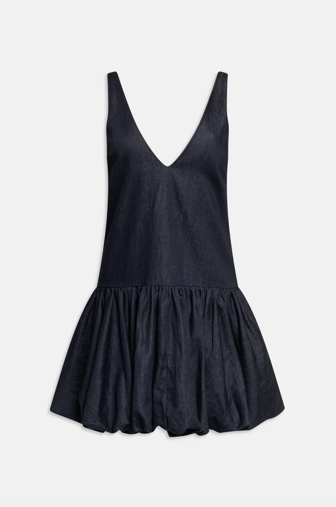 Abito corto a palloncino in chambray con ampio scollo a V.