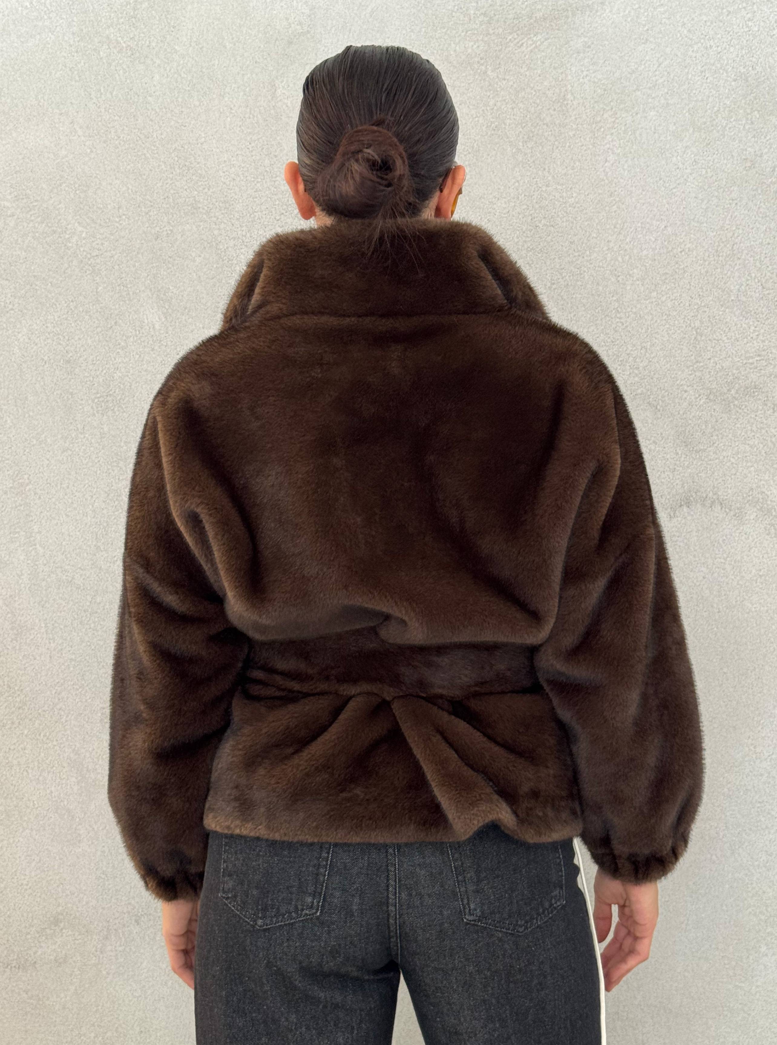 Cappottino in eco pelliccia color marrone bruno, con cintura in vita, bottoni a fermaglio nascosti