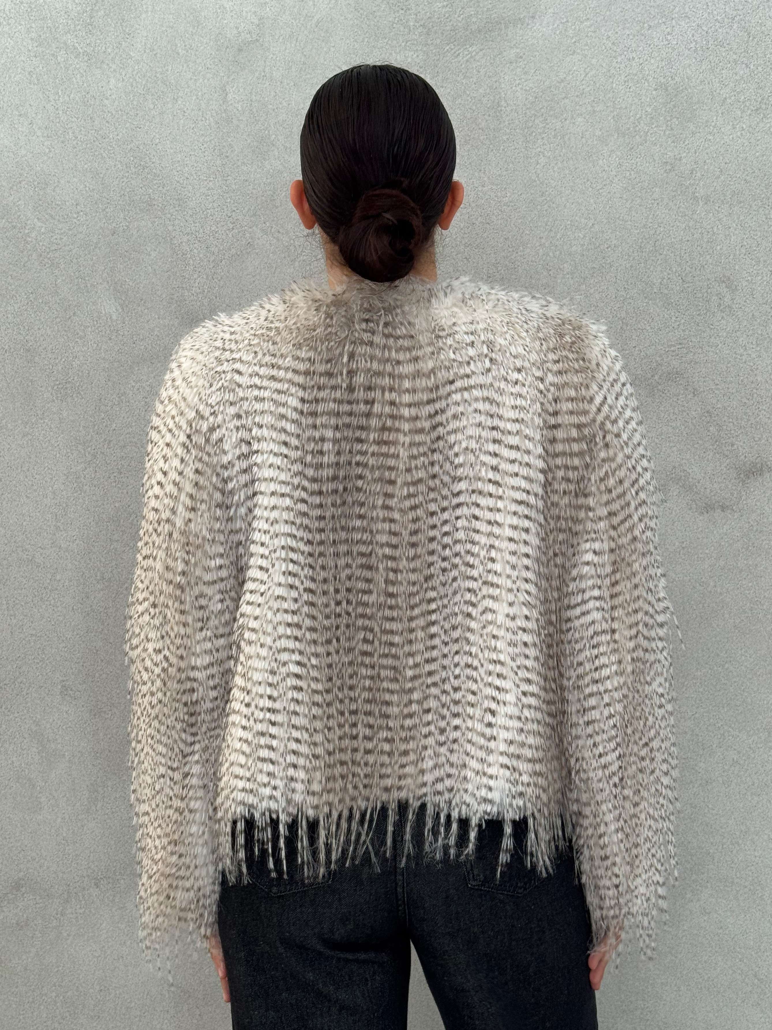 Cappotto in eco pelliccia color panna e tortora, chiusura con bottoni nascosti, doppia tasca laterale