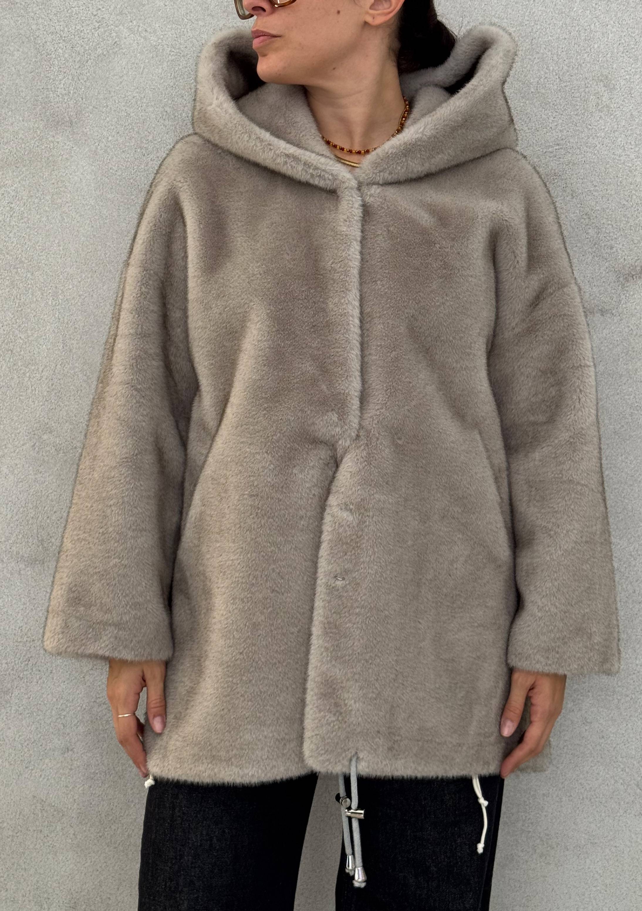 Pelliccia lunga in eco pelliccia color perla, con cappuccio, bottoni a fermaglio nascosti, coulisse sul fondo