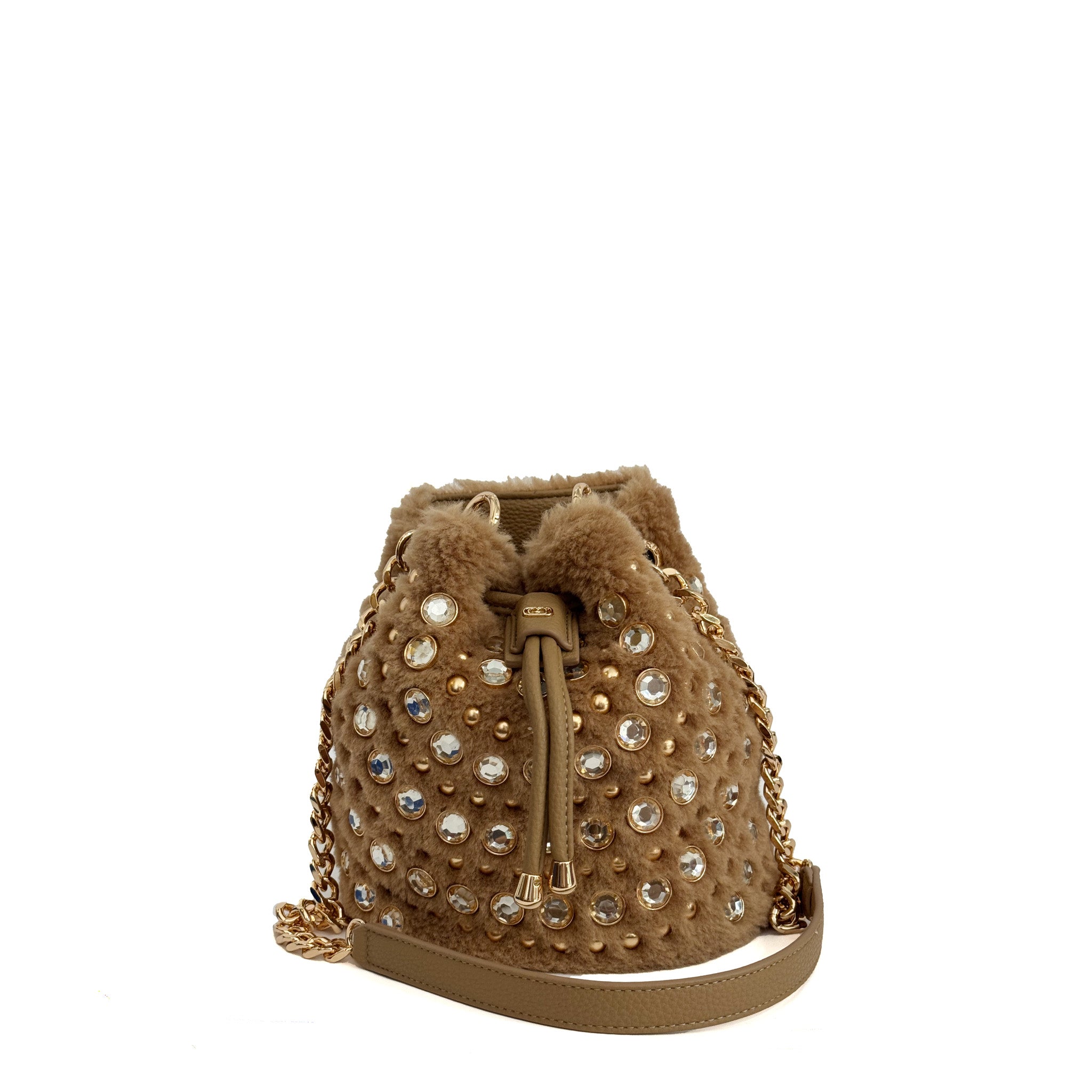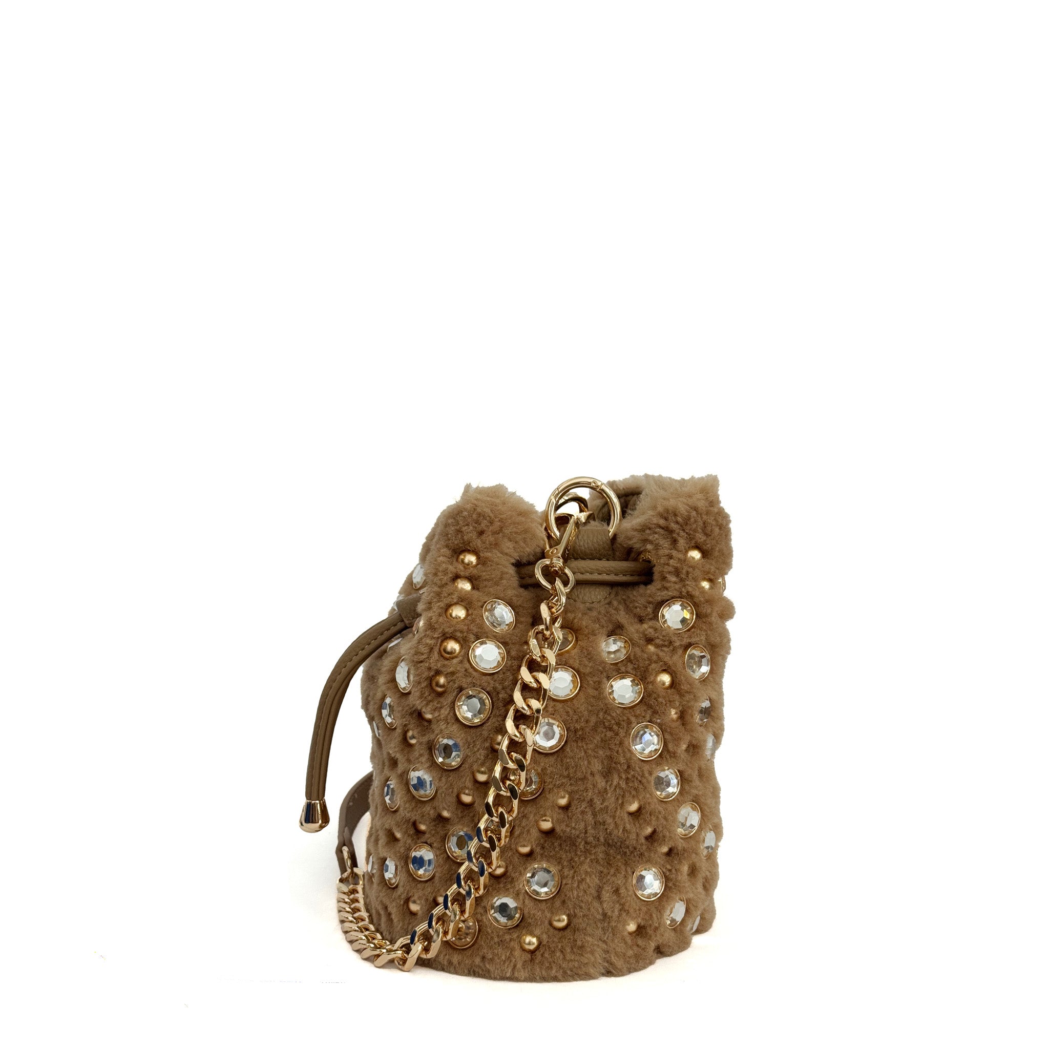 Secchiello piccolo in eco pelliccia con strass e borchie applicate, manico e tracolla rimovibile