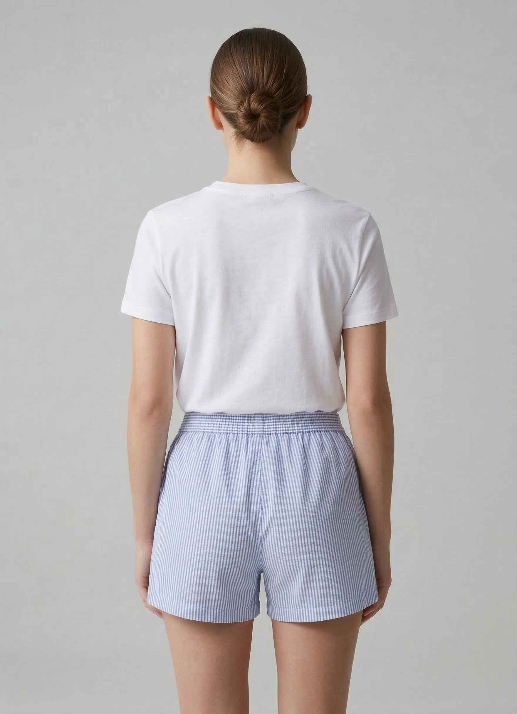 Gli shorts Amani sono realizzati in tessuto di puro cotone popeline, leggero e traspirante, pensato per offrire comfort e freschezza. Il design a righe definisce il capo con un’estetica grafica distintiva. Il modello presenta vita elasticizzata che assicura una vestibilità comoda e tasche alla francese sul davanti. La linea con gamba ampia e vita regolare garantisce una vestibilità rilassata.