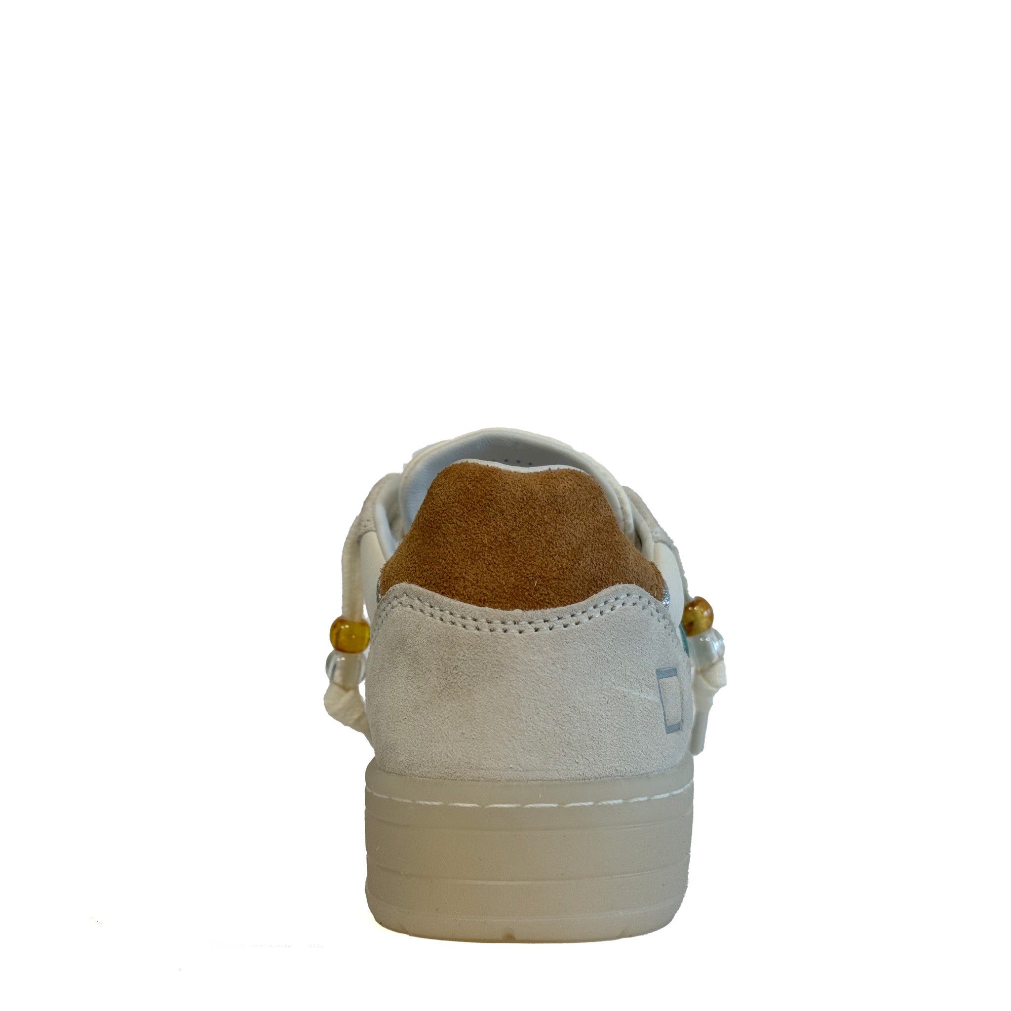 Le sneaker D.A.T.E. Court 2.0 Vintage Calf – White/Cuoio reinterpretano lo stile court in chiave contemporanea, unendo materiali di alta qualità e dettagli ricercati. Realizzate in pelle bianca, sono arricchite da inserti in pelle scamosciata grigia, finiture azzurre e color cuoio che donano profondità al design, e da raffinate perline applicate ai lacci, elemento distintivo e di tendenza.