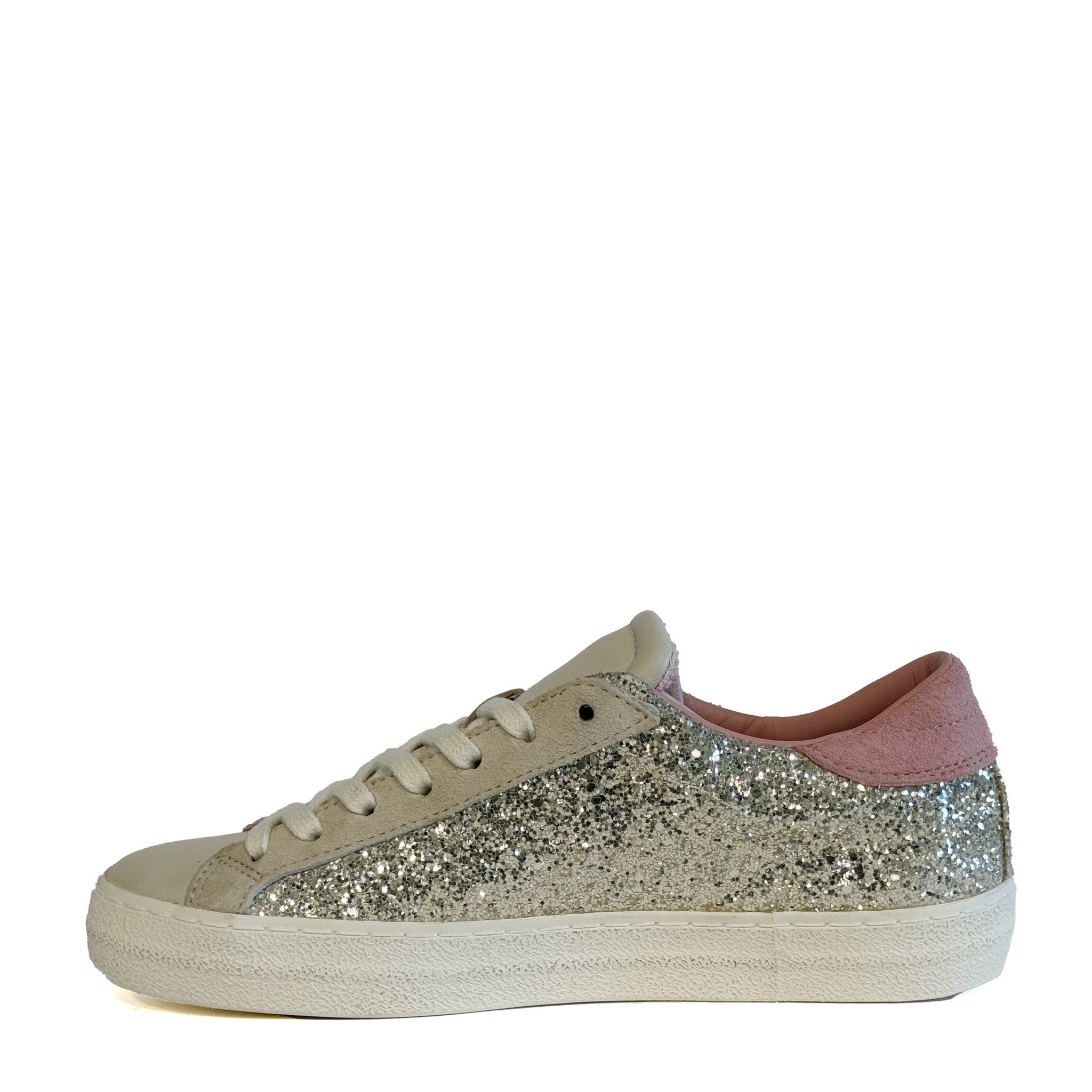 La sneaker D.A.T.E. Hill Low Glitter è la scelta ideale per chi desidera unire stile contemporaneo, comfort e dettagli luminosi. Realizzata in pelle liscia e pelle scamosciata color avorio, questa sneaker da donna si distingue per l’elegante glitter color platino che illumina il design e per il tallone rosa a contrasto, femminile e raffinato.