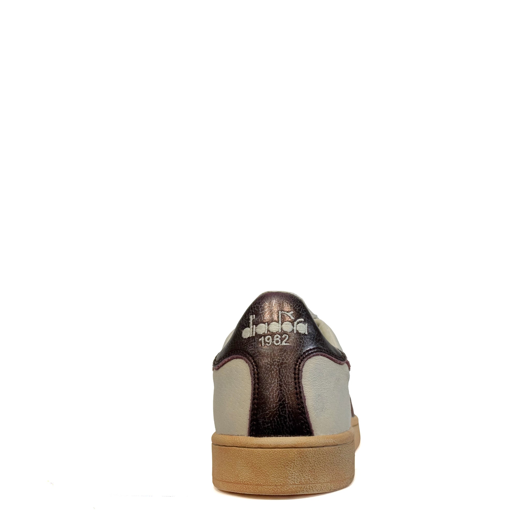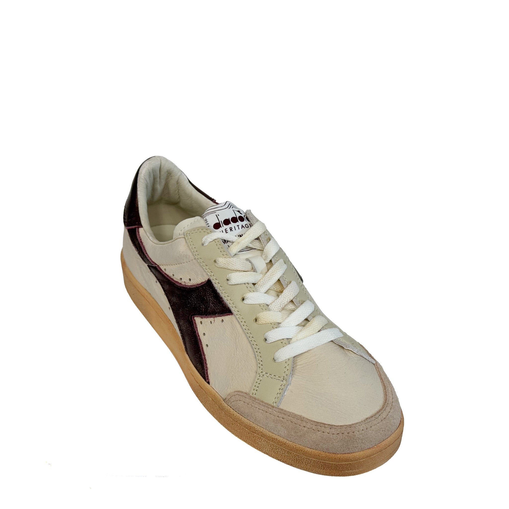 Le sneaker Diadora Prestige Aged Italia 30123 Bordò Cuoio sono realizzate in pelle beige con finiture bordeaux in pelle e dettagli scamosciati. La suola in gomma assicura comfort e stabilità, mentre fodera e soletta in pelle garantiscono traspirabilità e una calzata confortevole. Perfette per un look casual raffinato e contemporaneo.