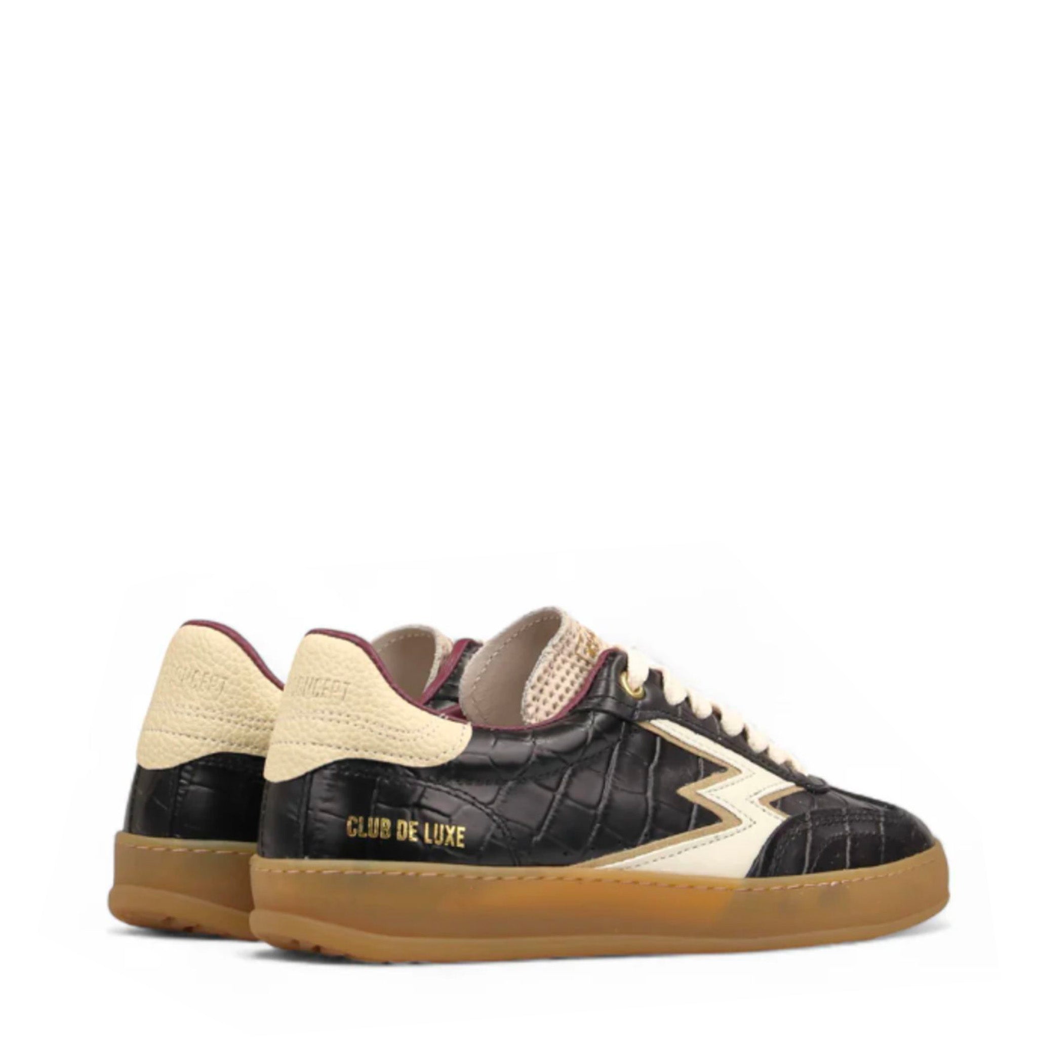 Sneaker bassa da donna nera realizzata in Italia in pelle stampa coccodrillo, con linguetta in pelle traforata bianco sporco, linguetta posteriore in pelle martellata color burro e collarino in pelle bordeaux. Versione Club De Luxe.