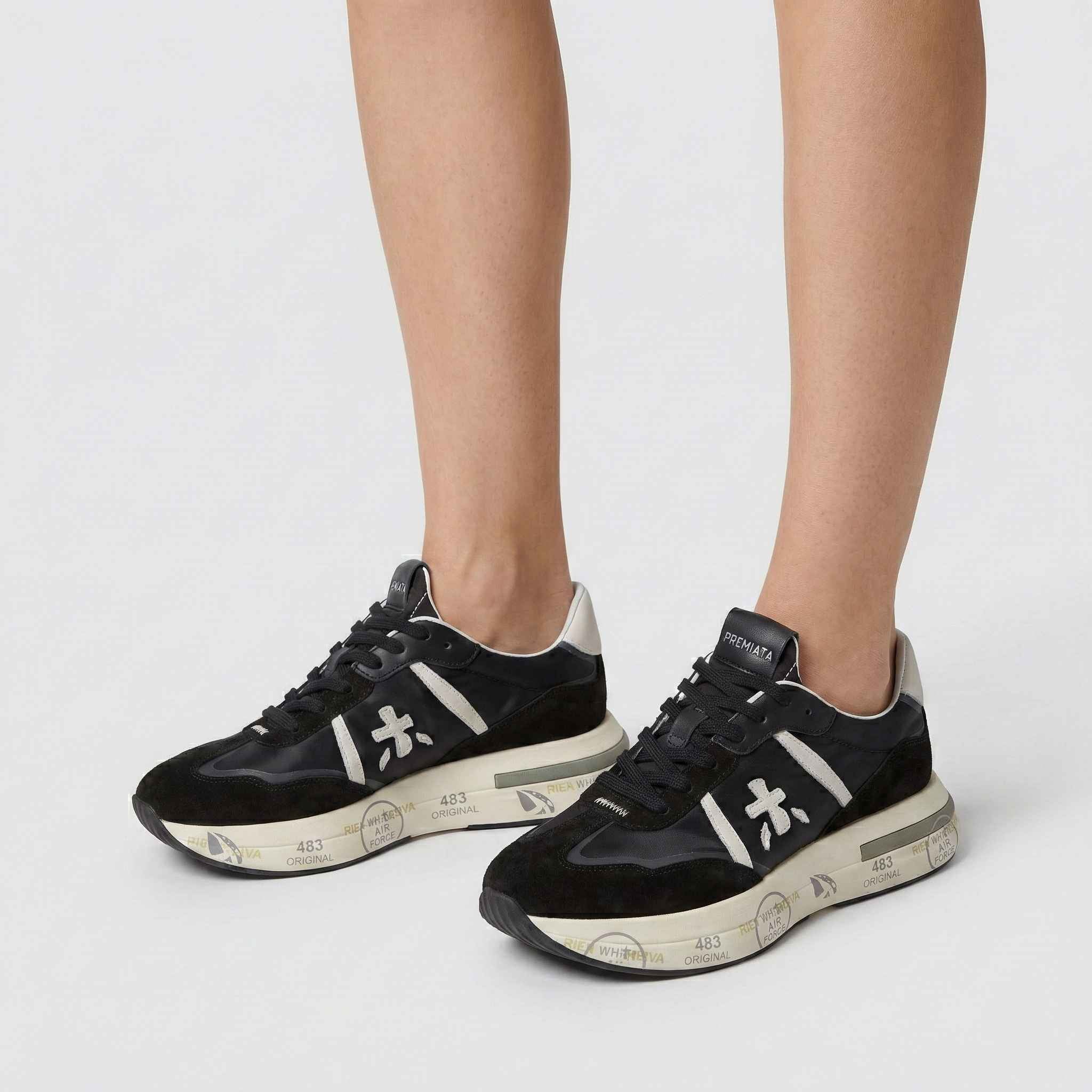 Queste sneakers, cariche di un'eredità risalente agli anni '70, si fondono con un mood contemporaneo per offrire un mix esclusivo tra tomaia in stile retrò e una struttura innovativa. Il design leggero e traspirante del tessuto, arricchito da dettagli in morbido suede, conferisce al modello un tocco casual glam. La suola alta 4,2 cm non solo valorizza il look, ma slancia la silhouette, assicurando anche comfort grazie al fusbet interno da 25 cm.