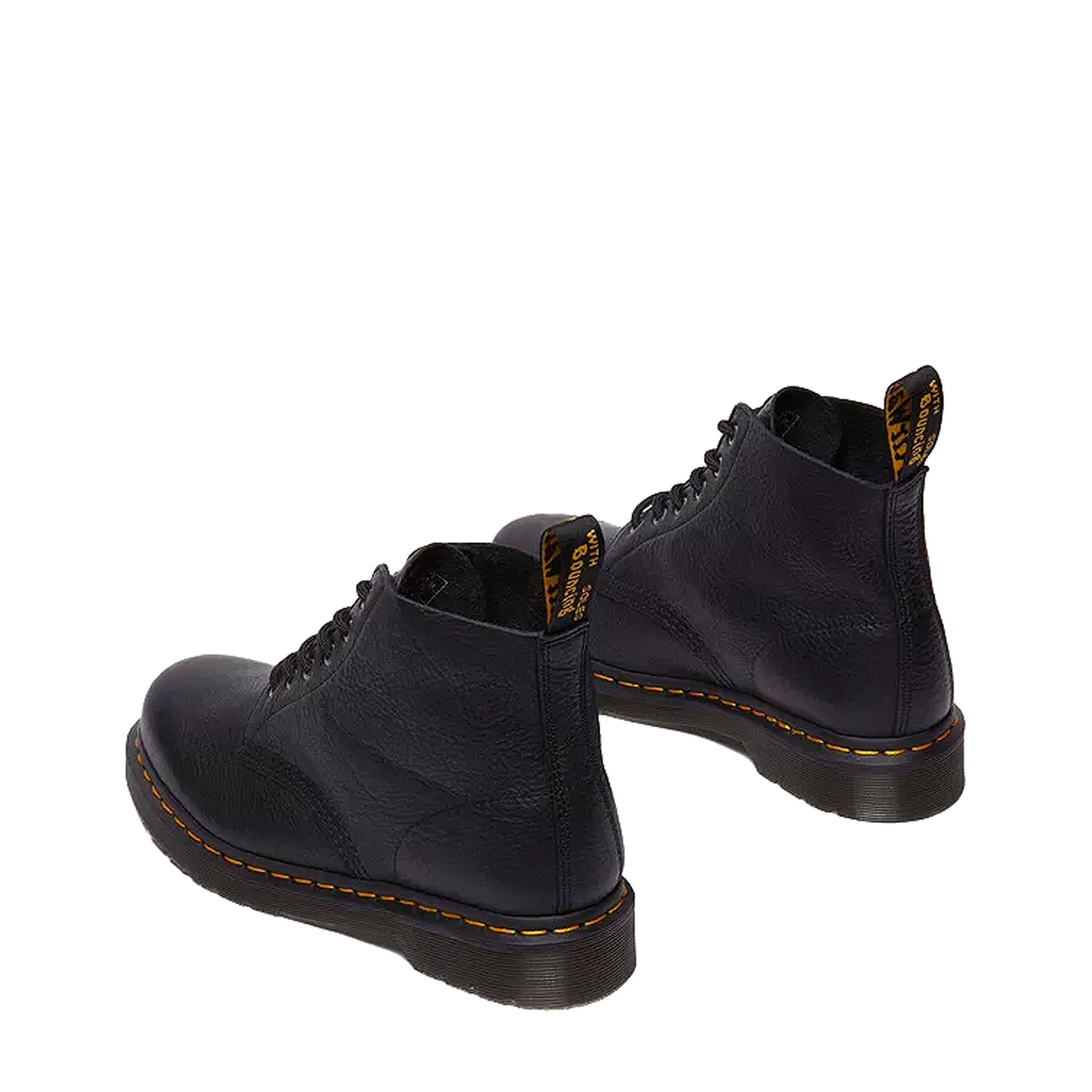 bbiamo rivoluzionato il nostro stivale con lacci 101 a sei occhielli utilizzando la lussuona Ambassador: una pelle morbida dall'aspetto testurizzato e martellato. La sua morbidezza rende il modello Dr. Martens Original ancora più facile da indossare. La suola presenta le classiche rifiniture gialle DM's e il nostro caratteristico motivo scanalato. Sul tallone, troverai sempre l'inconfondibile linguetta gialla e nera AirWair.