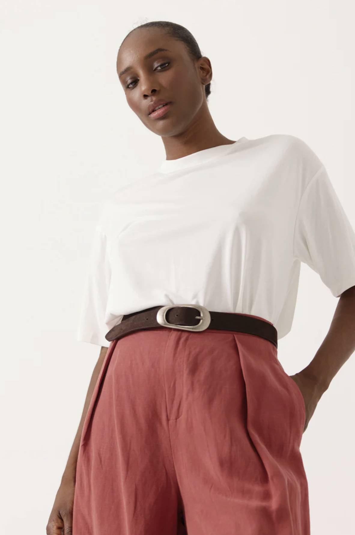 Maglietta a maniche corte Scollo tondo Taglio dritto, leggermente largo Materiale fluido e morbido Spalle leggermente scese per una silhouette rilassata.