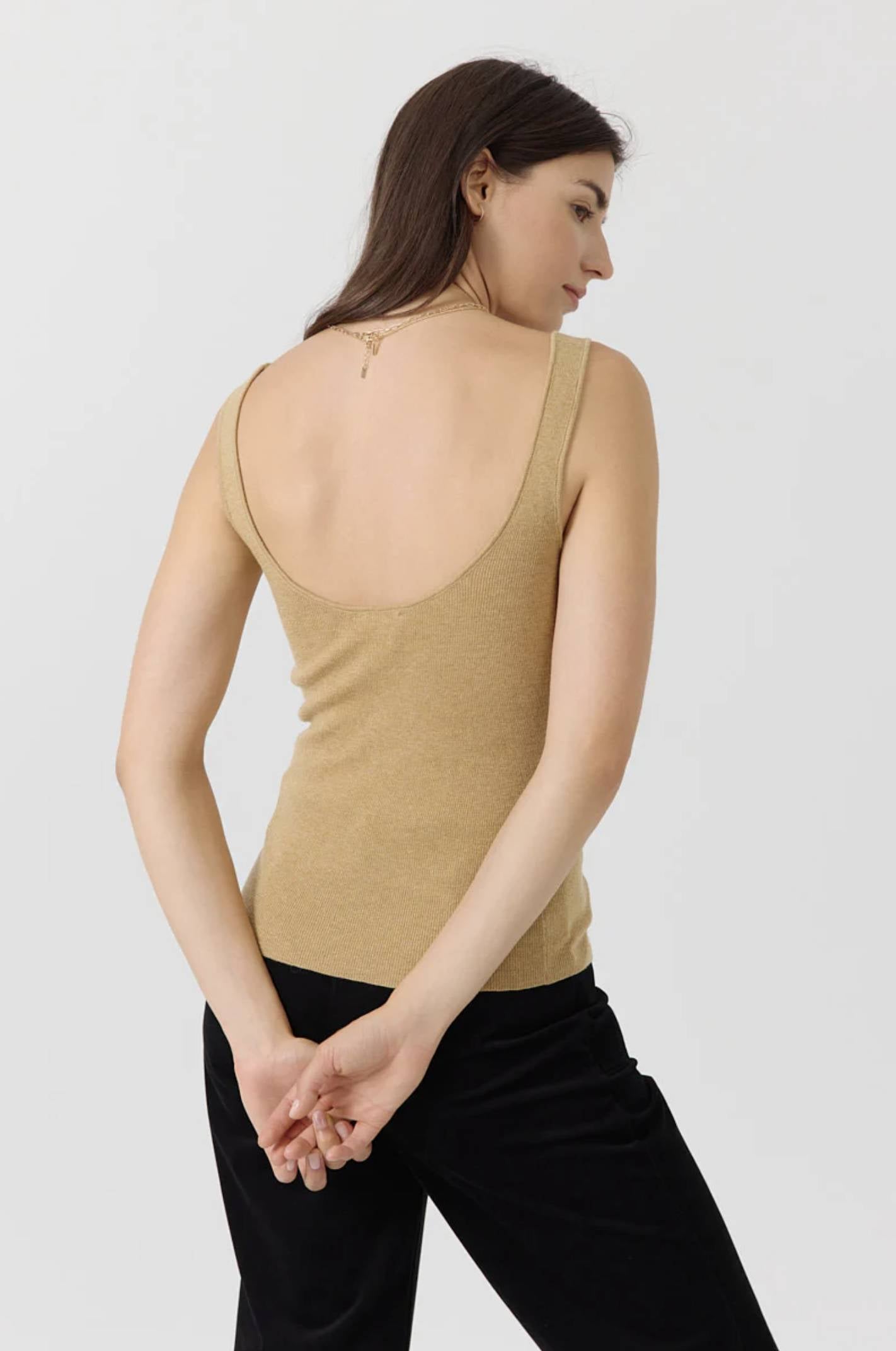 Canotta a coste a taglio aderente, con spalline larghe e scollo a barchetta, ideale per valorizzare il seno con eleganza. Il tessuto elasticizzato presenta un leggero effetto glitter che dona un tocco luminoso e sofisticato al capo. Realizzata in un mix di materiali di qualità (40% poliestere, 28% acrilico, 20% poliammide, 6% lana, 6% metallo), è perfetta per outfit femminili e versatili, da abbinare sia in look casual che più raffinati.